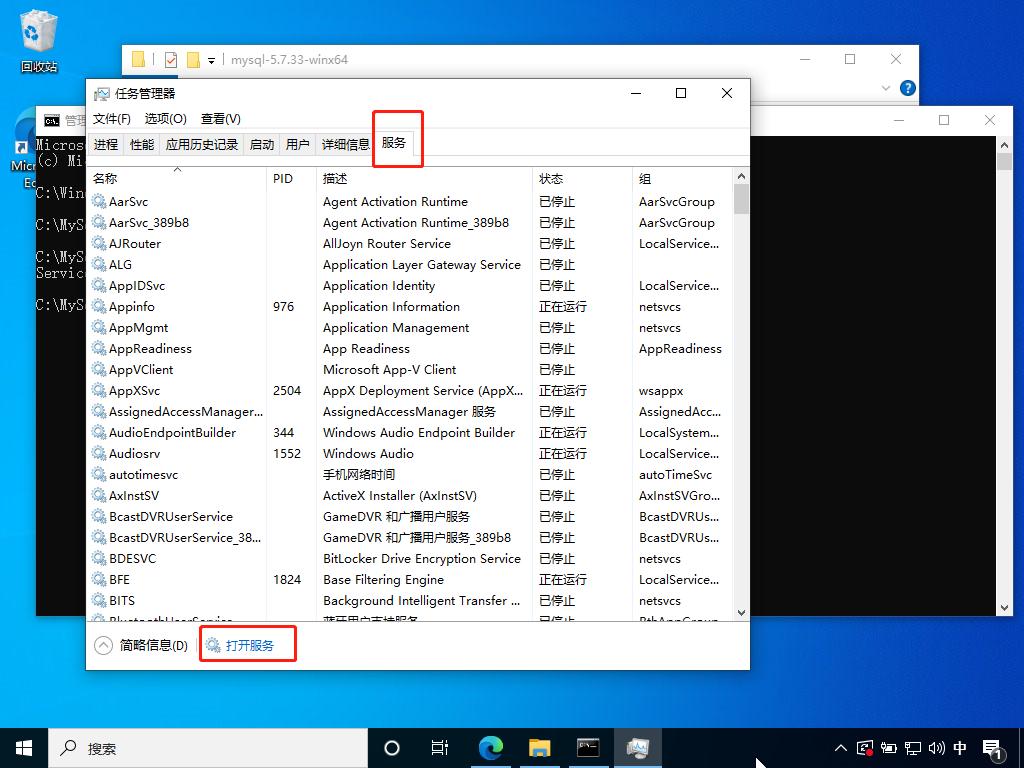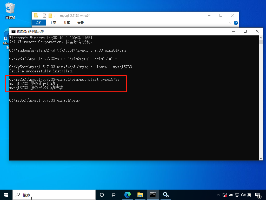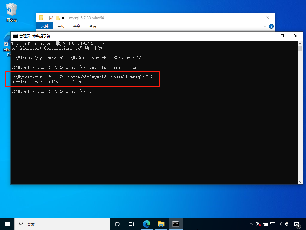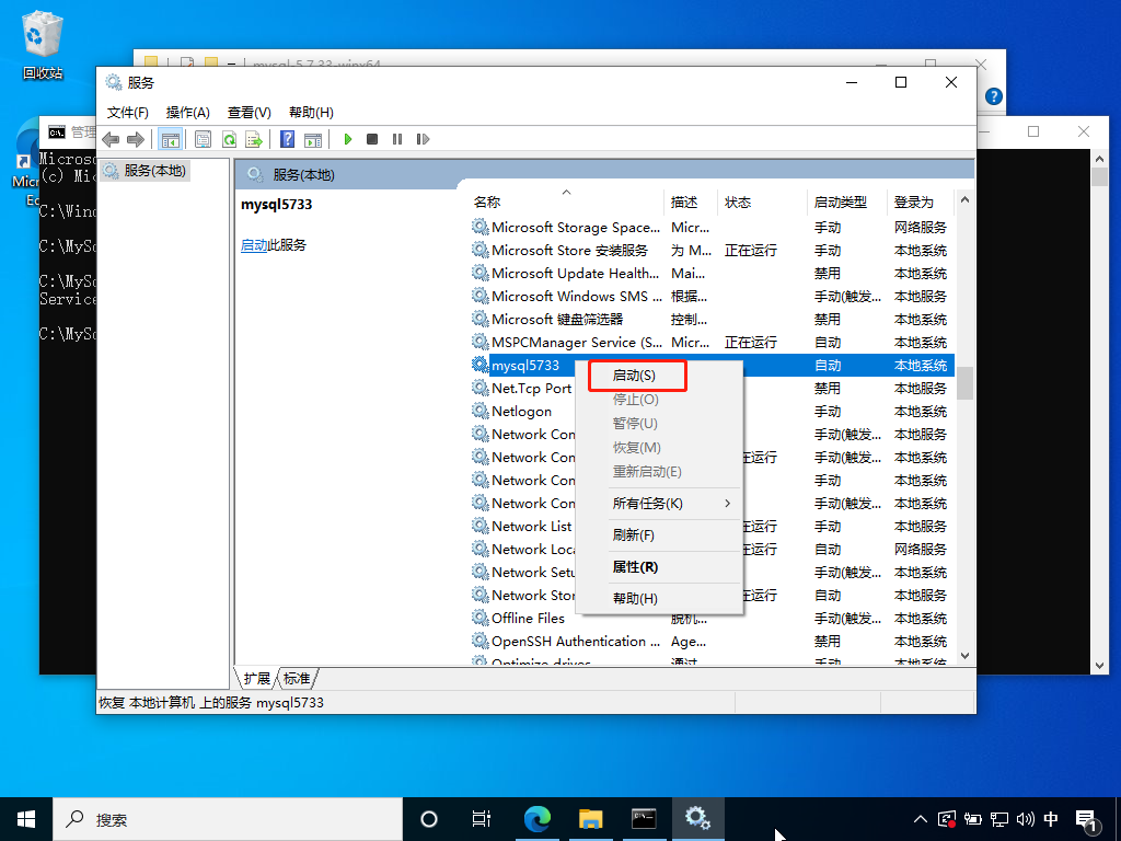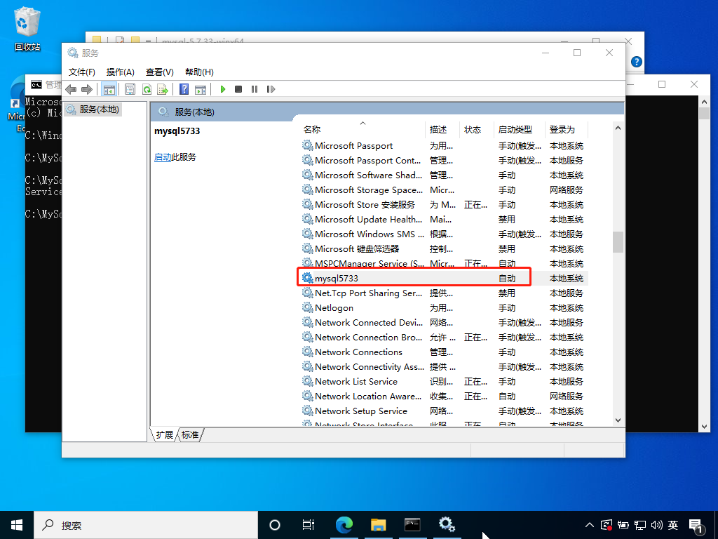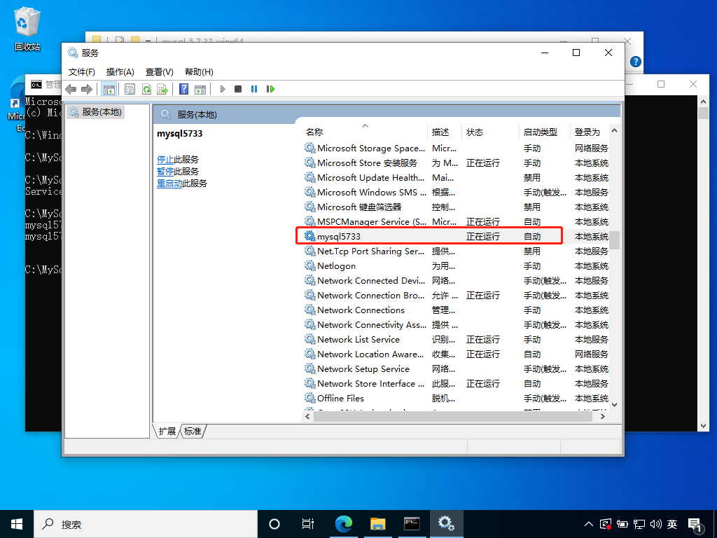 如上图所示,已成功注册MySQL到Windows服务,服务名为自定义的 mysql5733 。