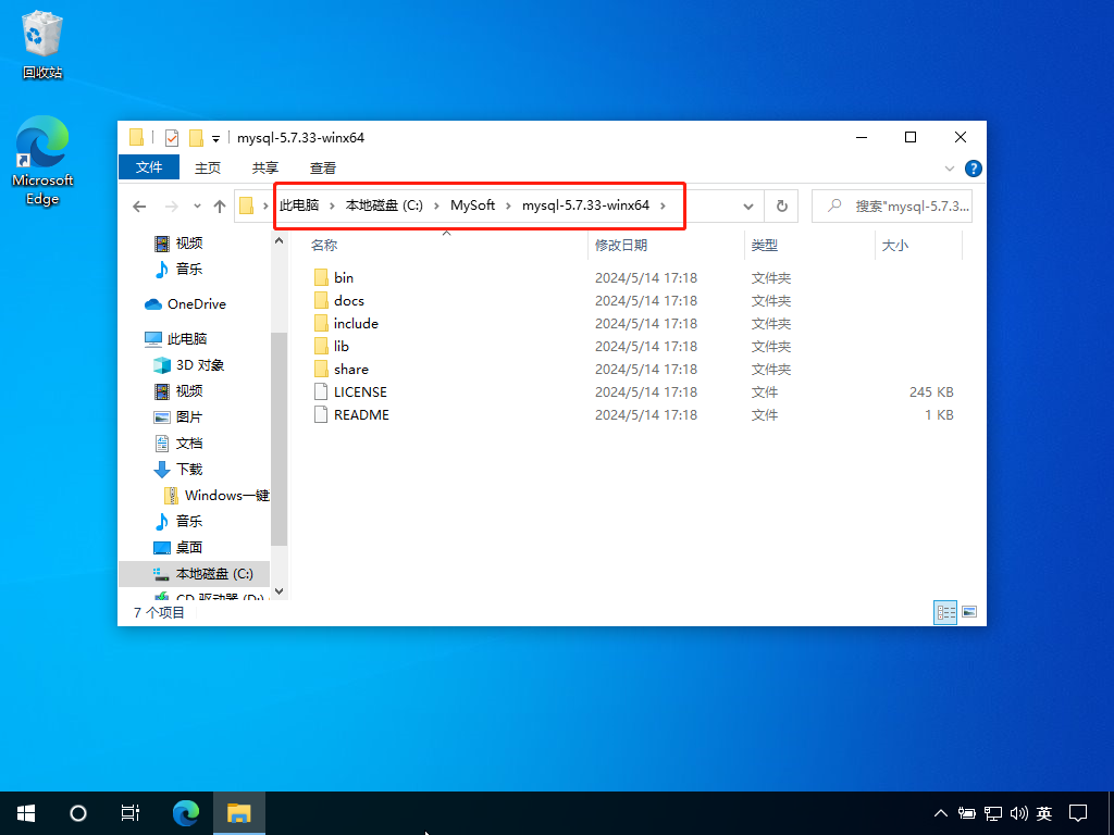 如上图所示,本例将 MySQL 的压缩包的文件解压到 MySoft 目录下,这个操作相当于指定了 MySQL 的安装目录。