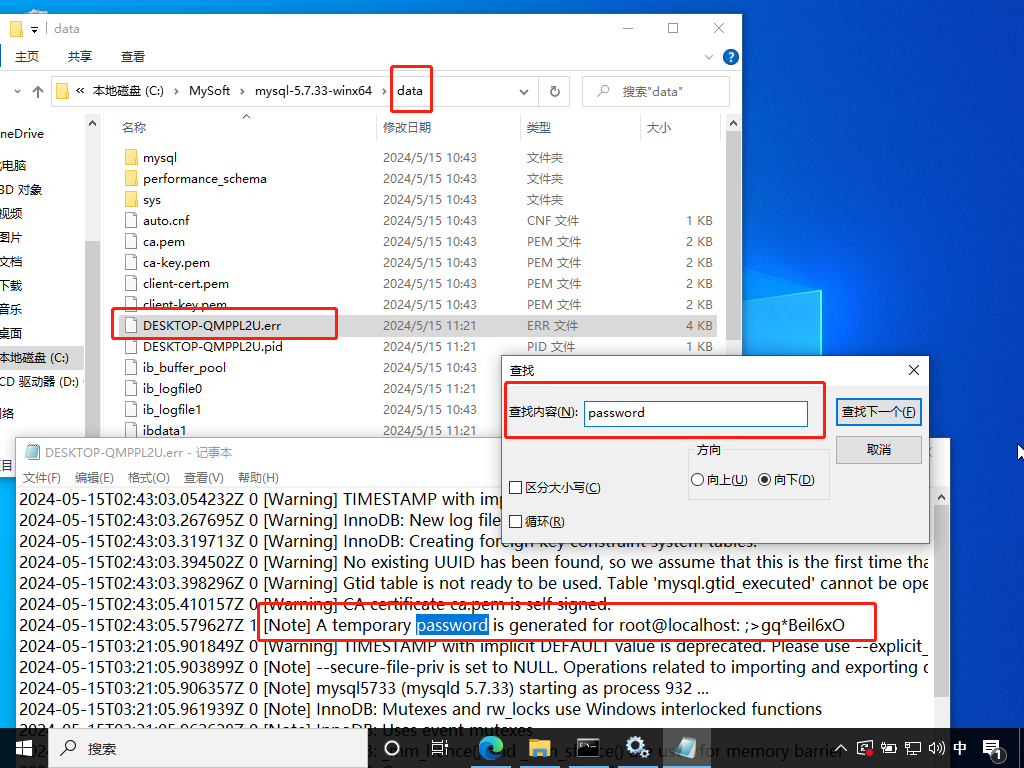 如上图所示,在 MySQL 的 data 目录的 DESKTOP-XXX.err 文件中,查找该MySQL数据库随机生成的初始化密码,本例为;>gq*Beil6xO