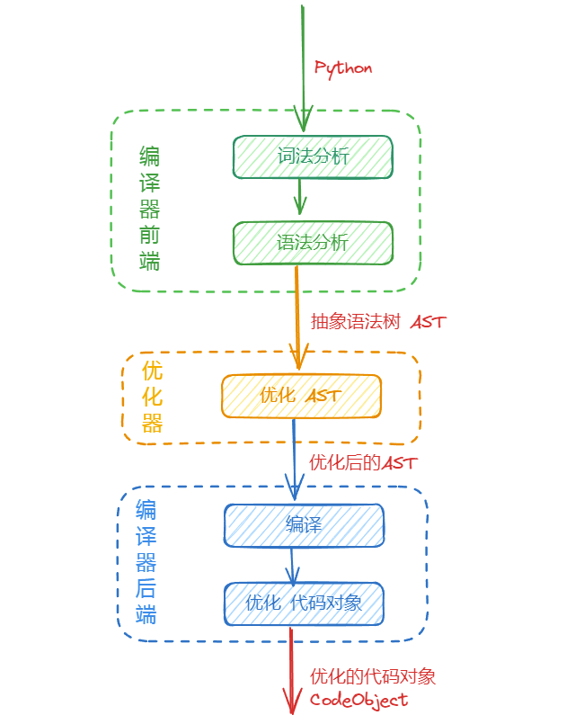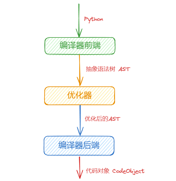 编译器也是采用的这种三阶段设计,只不过,它的编译器前端针对的是Python源码,中间代码是抽象语法树(AST