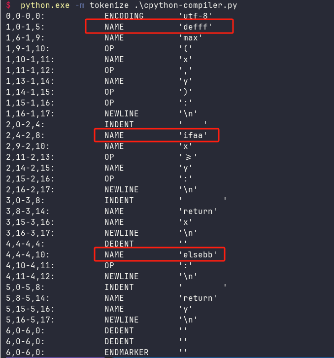 $ python.exe -m tokenize .\cpython-compiler.py
