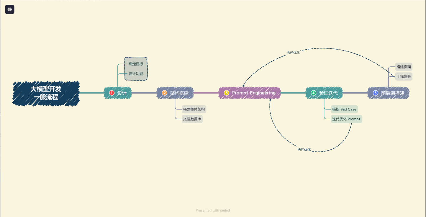 - Prompt Engineering。优质的 Prompt 对大模型能力具有极大影响,我们需要逐步迭代构建优质的 Prompt Engineering 来提升应用性能。在该步中,我们首先应该明确 Prompt 设计的一般原则及技巧,构建出一个来源于实际业务的小型验证集,基于小型验证集设计满足基本要求、具备基本能力的 Prompt。