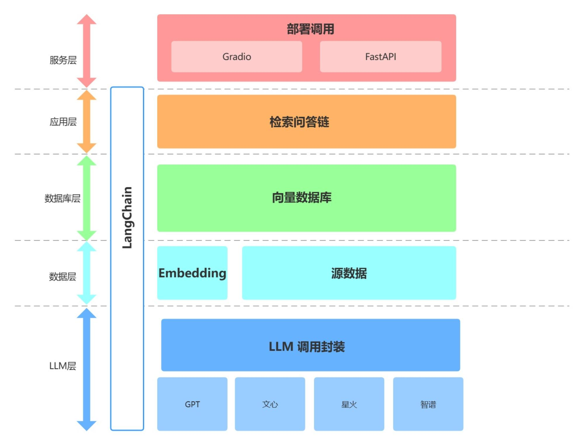 如上,本项目从底向上依次分为 LLM 层、数据层、数据库层、应用层与服务层: