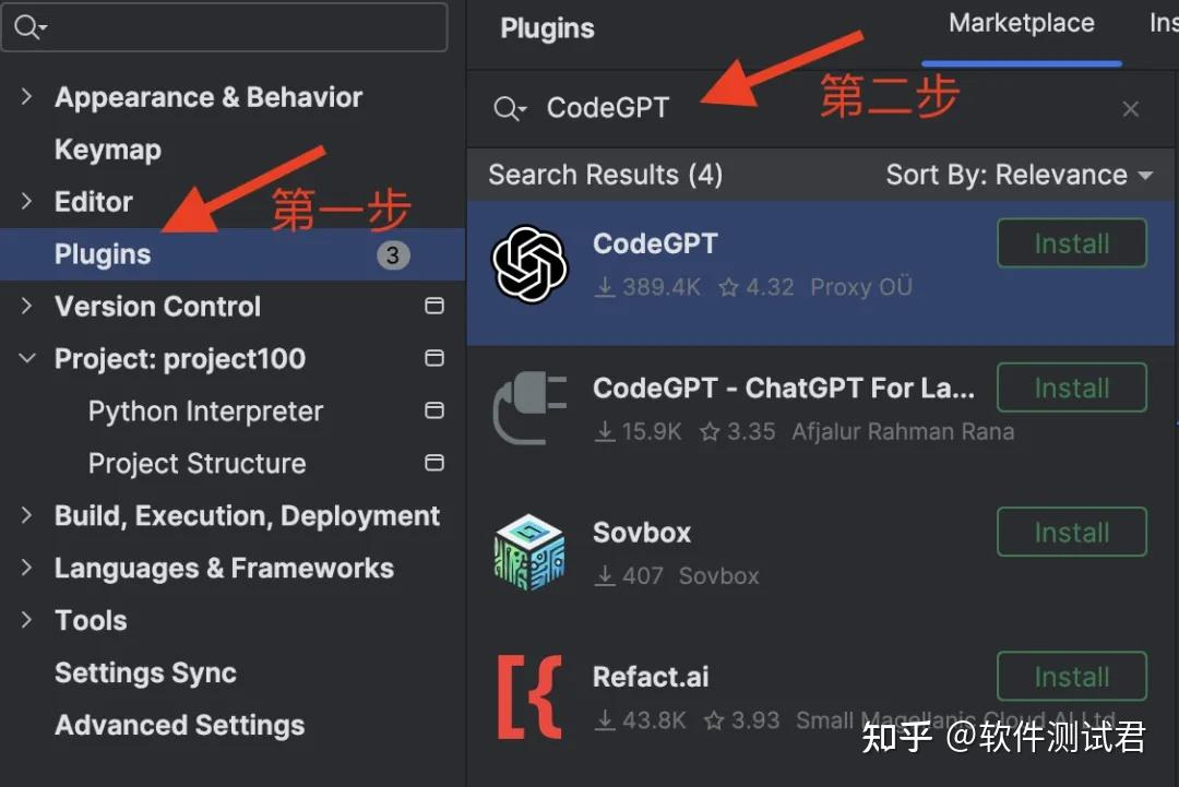首先下载插件CodeGPT,打开第一步安装的PyCharm,找到文件(File)-设置(Settings)-插件(Plugins),输入CodeGPT,点击安装(Install)即可。