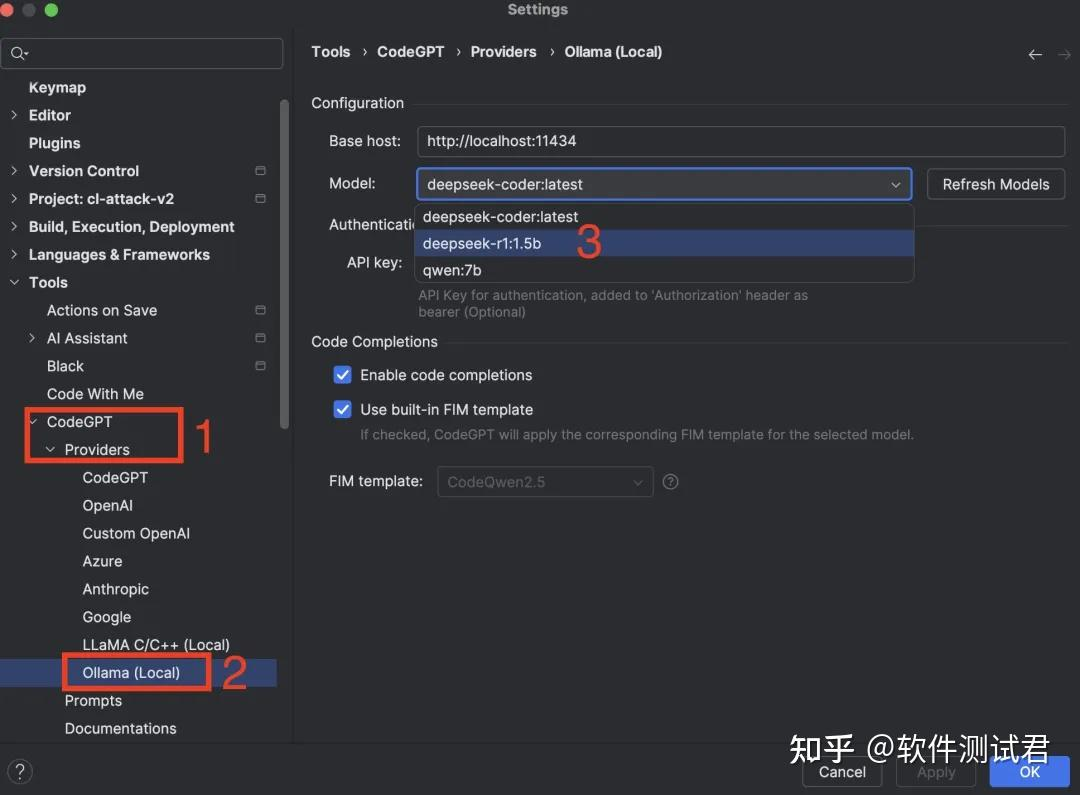 安装后在工具(Tools)下会出现CodeGPT,点击Providers,找到Ollama(Local),再到对应位置选择刚刚安装的deepseek – r1:1.5b,点击OK就大功告成了。