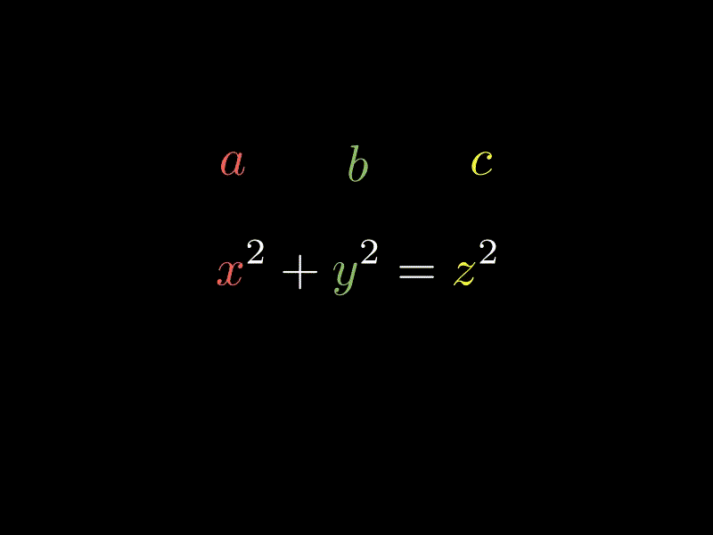 f2 = MathTex("{{x}}^2", "+", "{{y}}^2", "=", "{{z}}^2")