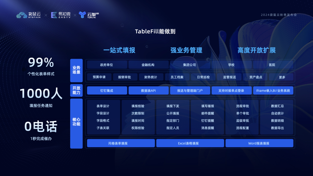 为了应对这一挑战,我们今年推出了多层级数据填报与报送平台TableFill,旨在满足客户的多样化需求。TableFill提供个性化的表单、表格和Word填报方式,支持一键下发任务、审批、催办和统计功能,能够满足政府、企业及高校等机构在多层级数据填报和数据采集方面的需求。使用TableFill,一天内即可完成以往需要1000人完成的数据填报工作。