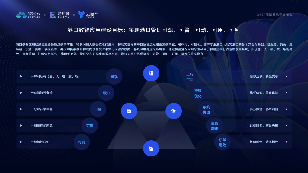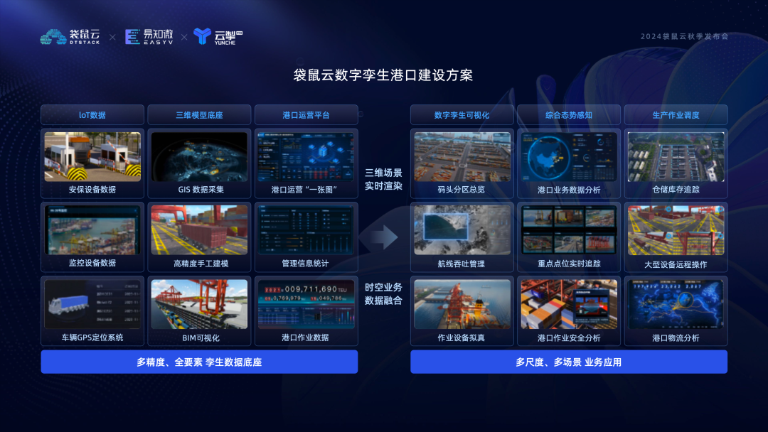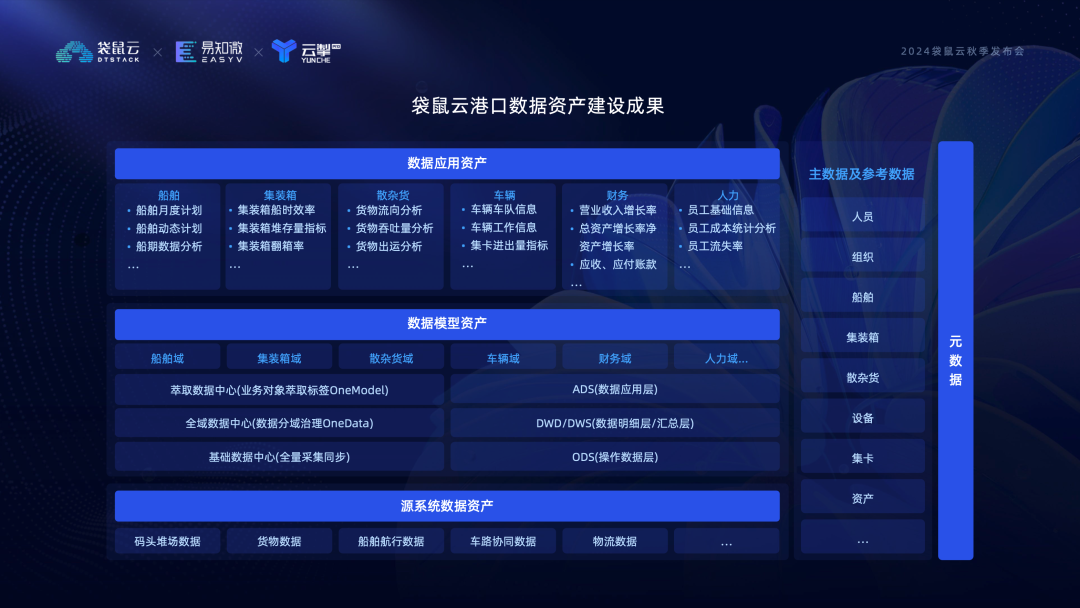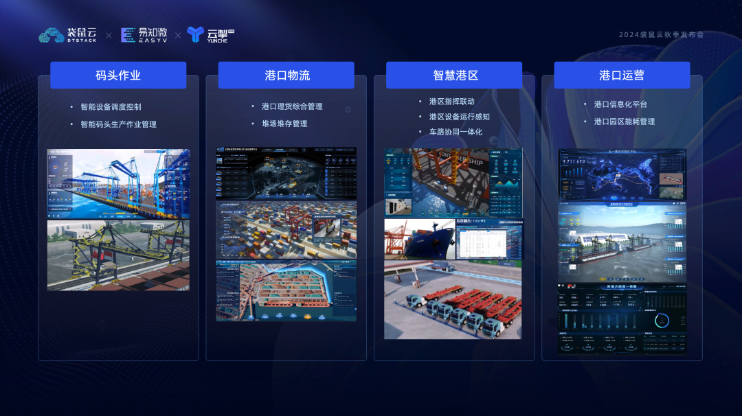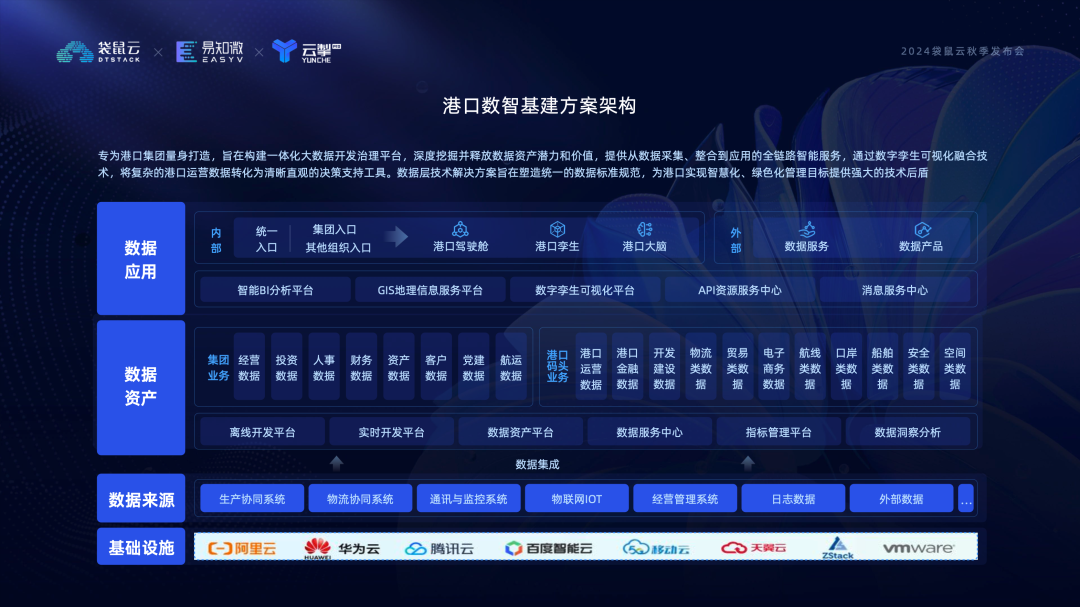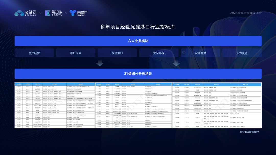 基于以上背景,袋鼠云从数智基建到数智应用层,结合目前港口行业数智化发展特点及技术要求,在本次2024袋鼠云秋季发布会中正式发布袋鼠云港口数智化解决方案,帮助港口行业客户和伙伴构建Data+AI生产力。方案结合袋鼠云多年港口行业服务经验,通过对港口行业数智化升级发展重点模块的深度剖析,为港口集团提供全链路数智基建及数智应用的产品及服务,围绕码头作业、港口物流、智慧港区、港口运营等典型场景进行实践分析与方案分享,进一步帮助港口集团及上下游服务商构建数智化能力,共同推动港口行业加速发展、升级。