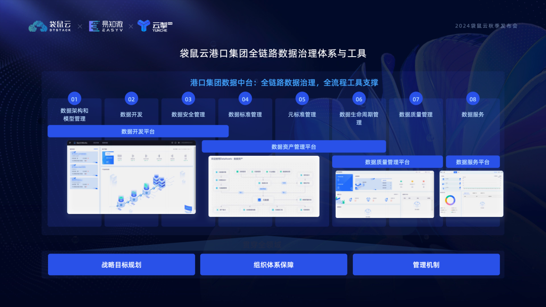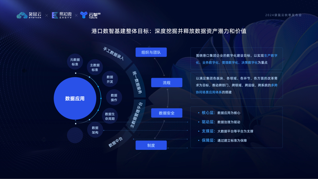 袋鼠云针对港口数智基建方面,以深度挖掘并释放数据资产潜力和价值为核心目标,帮助港口集团企业实现生产、业务、管理、决策全方位数智化。结合当前港口客户的业务需求,袋鼠云以数据应用为核心,数据治理为驱动,通过一系列国产自研的数据治理开发、管理平台作为支撑,同时建立组织与团队、流程、制度以及数据安全层面标准作为保障,从而实现跨部门、跨领域、快层级、跨系统的港口集团多跨协同场景应用体系的搭建。
