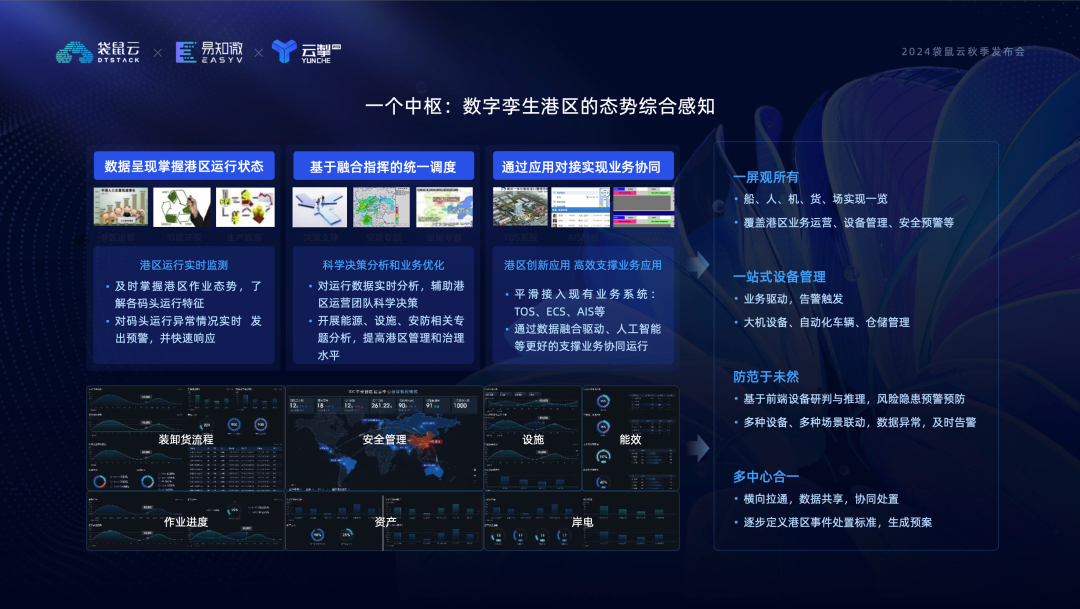 同时,在实际项目建设过程中,袋鼠云进行港口态势综合感知建设,构建港口数智化“中枢”,实时监测港区运行状态,实现数据驱动的决策分析和业务优化。袋鼠云在“中枢”集成装卸货流程、作业进度、安全管理、设施能效和岸电等信息,支持一站式设备管理,防范潜在风险,并通过多中心合一实现高效业务协同,形成对数字孪生港区的综合态势感知。