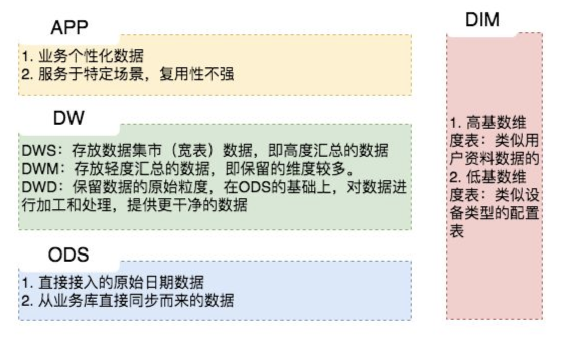 一般来讲,该层的数据表会相对比较少,一张表会涵盖比较多的业务内容,由于其字段较多,因此一般也会称该层的表为宽表。在实际计算中,如果直接从DWD或者ODS计算出宽表的统计指标,会存在计算量太大并且维度太少的问题,因此一般的做法是,在DWM层先计算出多个小的中间表,然后再拼接成一张DWS的宽表。由于宽和窄的界限不易界定,也可以去掉DWM这一层,只留DWS层,将所有的数据在放在DWS亦可。