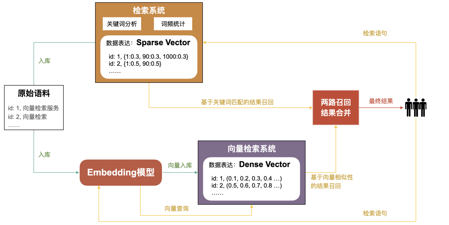 针对上述问题,逐渐有业务和系统演化出来”两路召回、综合排序”的方法来解决,并且在效果上也超过了单纯的关键字检索或语义检索,如下图所示: