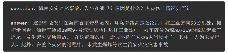 做好这些准备工作以后,就可以对LLM做与具体知识点相关的提问了。比如在 CEC-Corpus 新闻数据集里,有如下一篇报道。因为整个新闻数据集已经在之前的步骤里,转换成向量入库了,我们现在就可以把这个新闻报道作为一个知识点,做出针对性提问:海南安定追尾事故,发生在哪里?原因是什么?人员伤亡情况如何?,并查看相应答案。