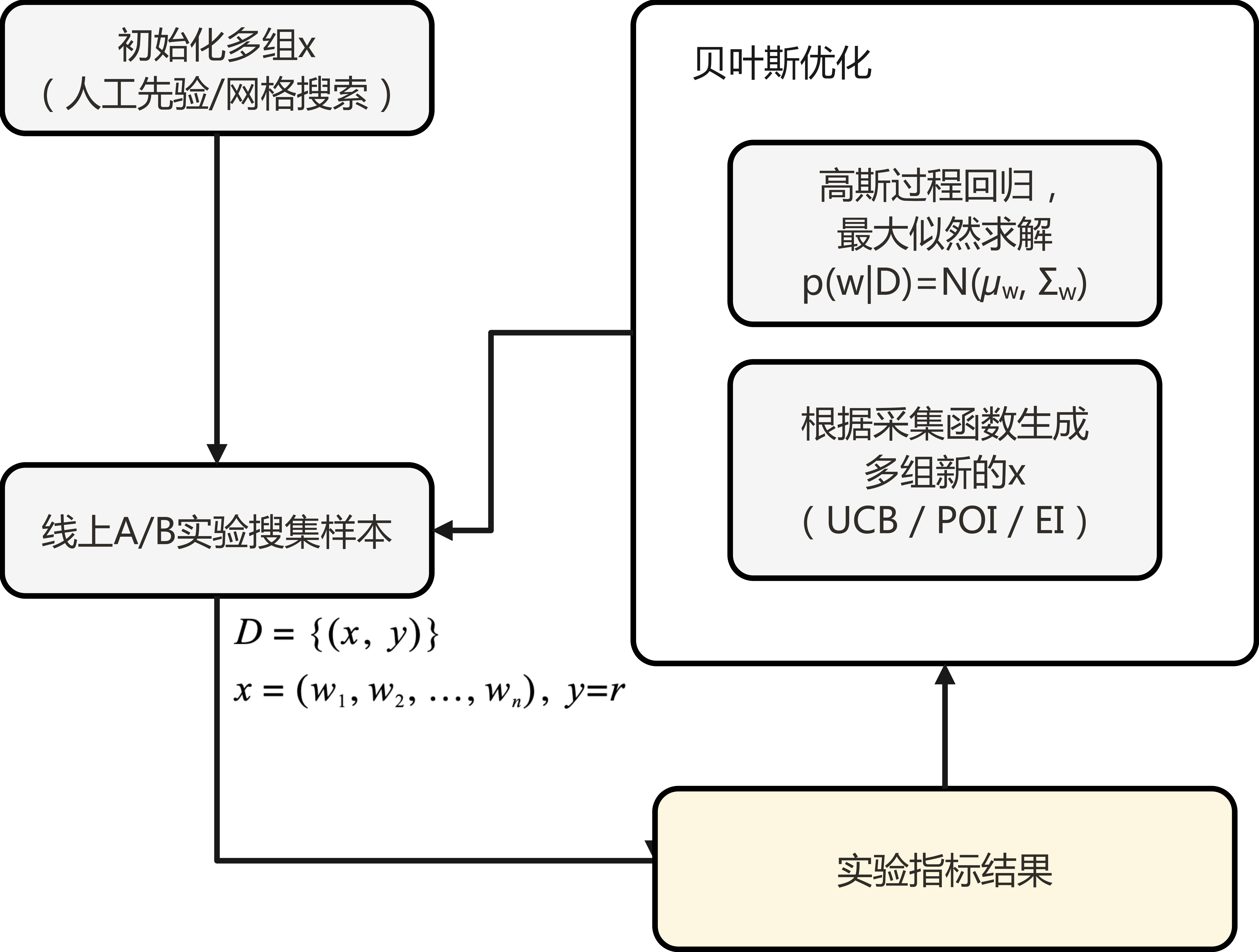 贝叶斯优化算法充分考虑了真实的线上收益,通过收集多组小流量经验,基于小流量实验的评估结果来进行参数优化。