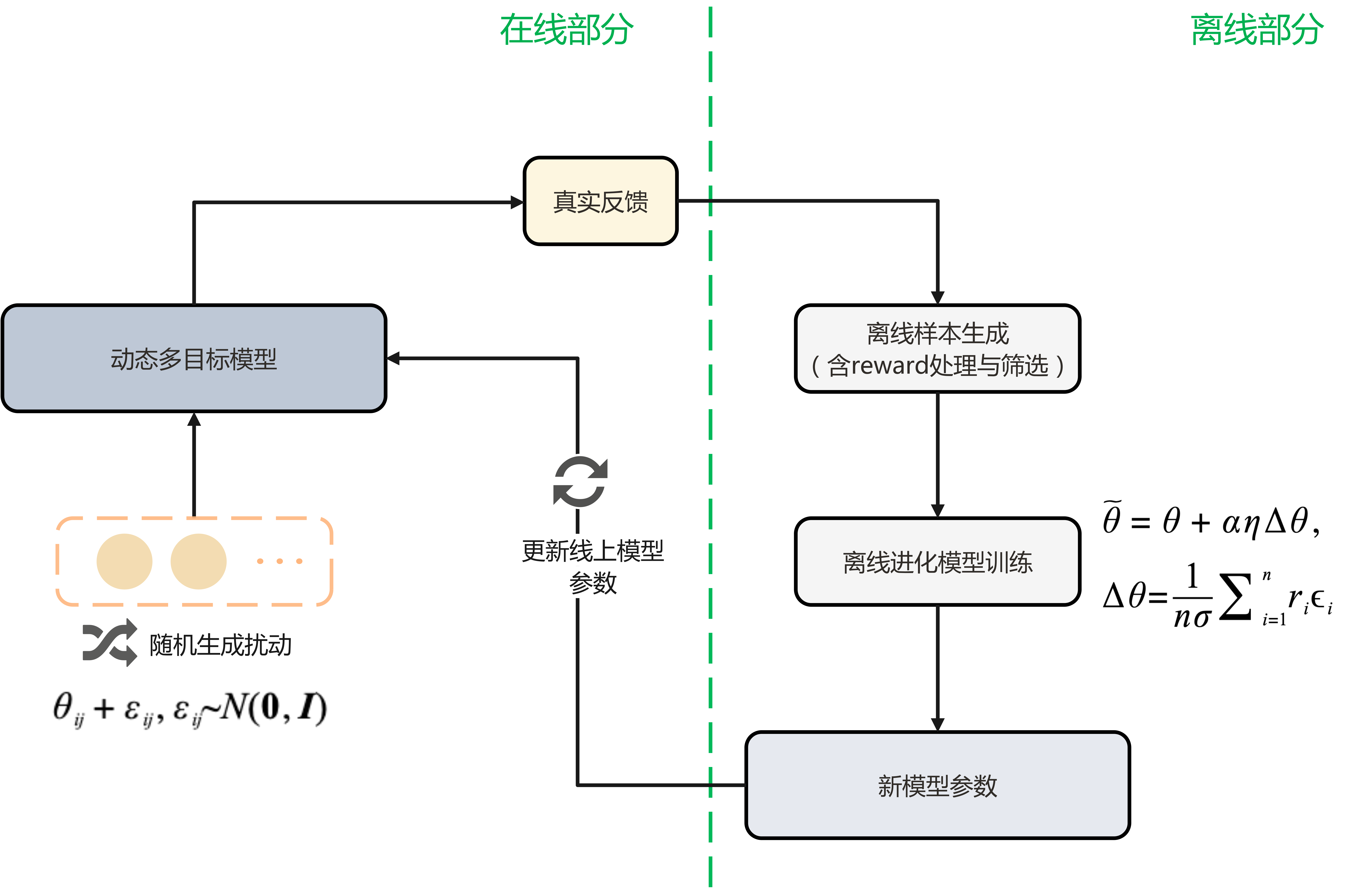 如上图所示,使用进化学习算法,线上对模型参数进行扰动,根据扰动后的结果来计算reward(常设置为人均或单刷的停留时长/播放时长/深度消费等关键业务指标),并离线进行小时级模型训练。观察到较优模型参数组合后,则更新线上的baseline模型参数。