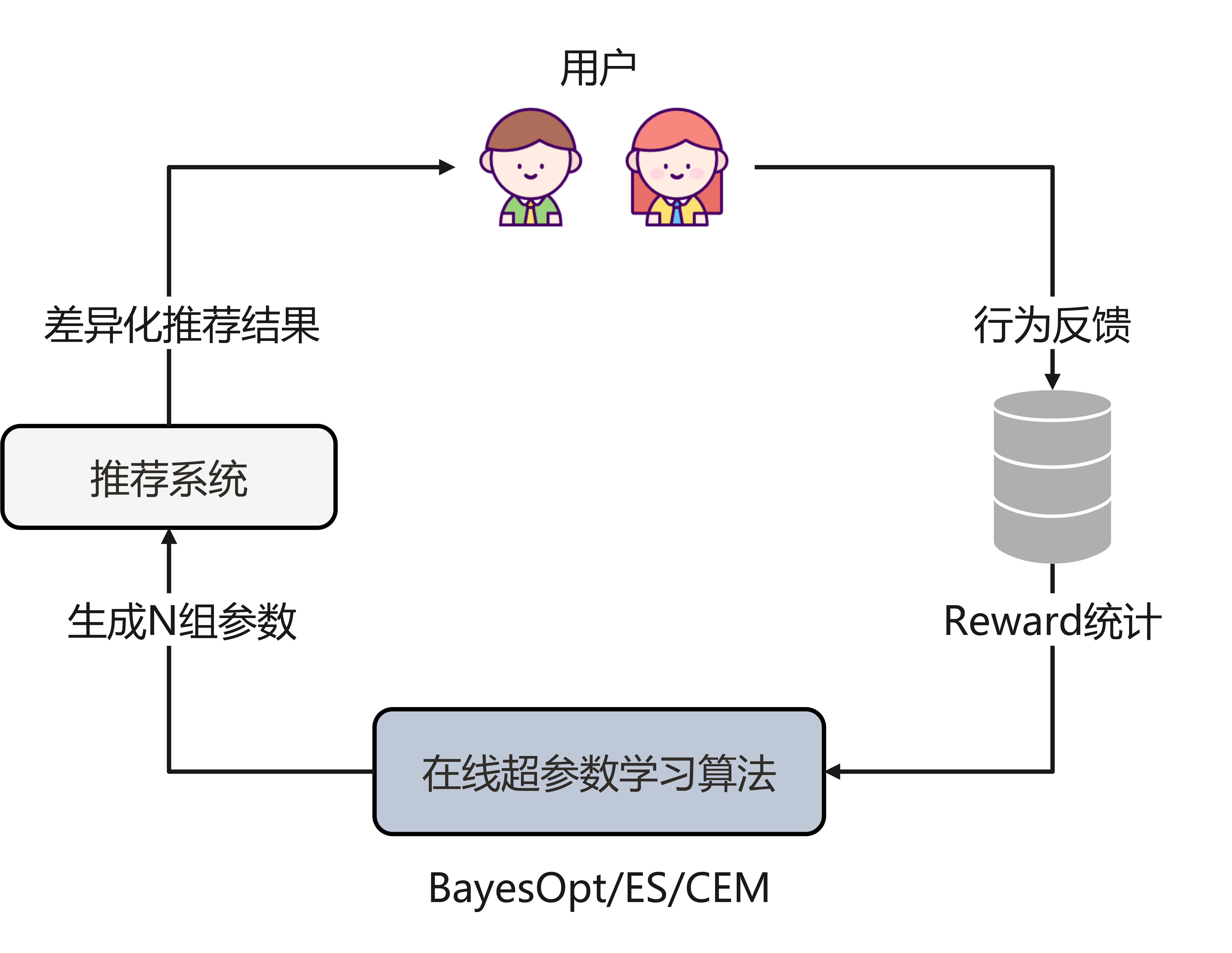 可以看到,在线超参数学习算法基于探索与利用机制,会在baseline附近探索生成\(N\)组参数,传给推荐系统后获得这\(N\)组参数对应的展现给用户的差异化排序结果,从而获得不同用户的反馈。之后再收集这些反馈日志并做收益(reward)统计,最终送给BayesOpt/ES/CEM等调参算法产生下一组更好的参数。经过不停迭代,参数就会向一个多目标协调最优的方向前进。
