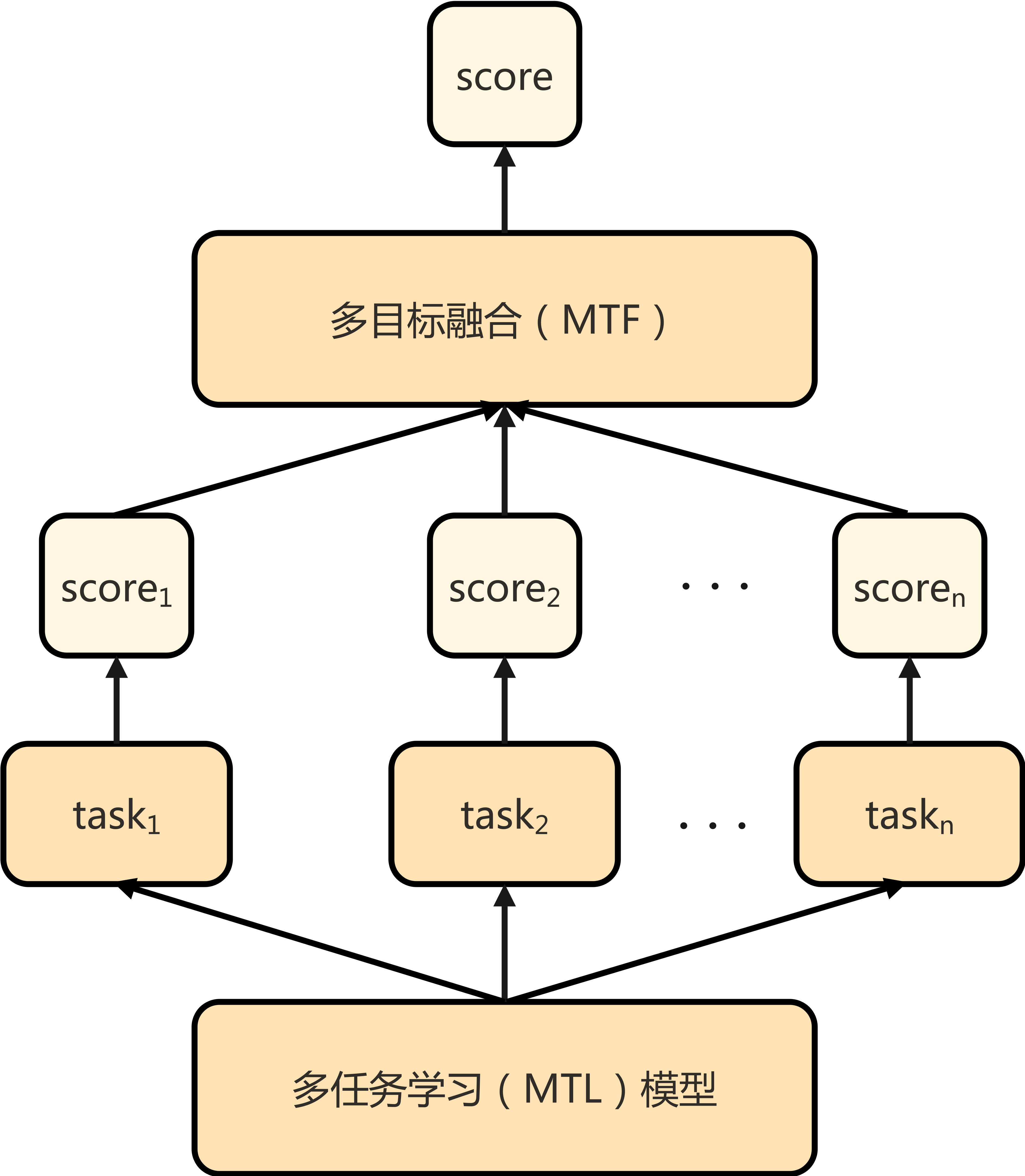 如上图所示,多目标融合模型在精排MTL模型输出多个预估分数(对应上述各种用户的反馈)之后,对多个预估分数进行融合,随后根据融合的打分进行精排,并输入到后续的重排模块。
