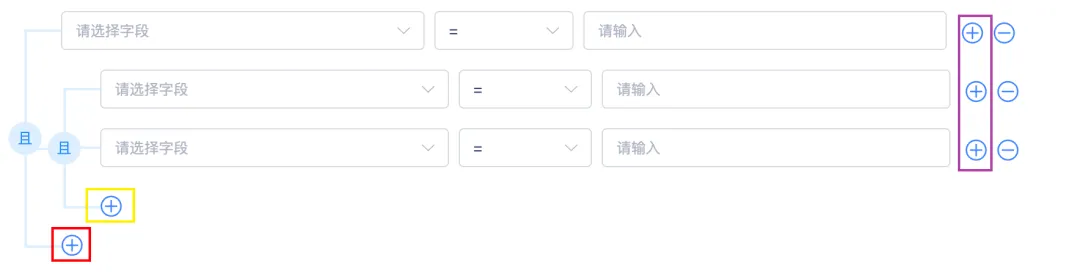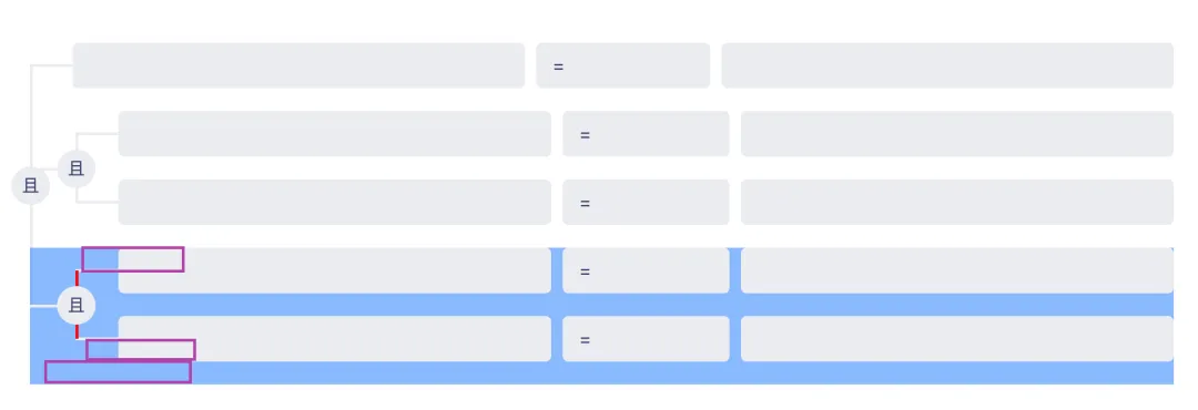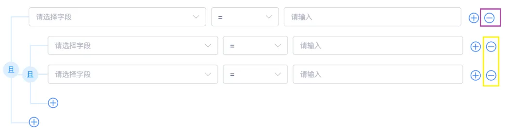 · 点击紫色按钮,第二个条件节点只剩一个 children,需要删除第二个条件节点,且重新计算每一行的层级