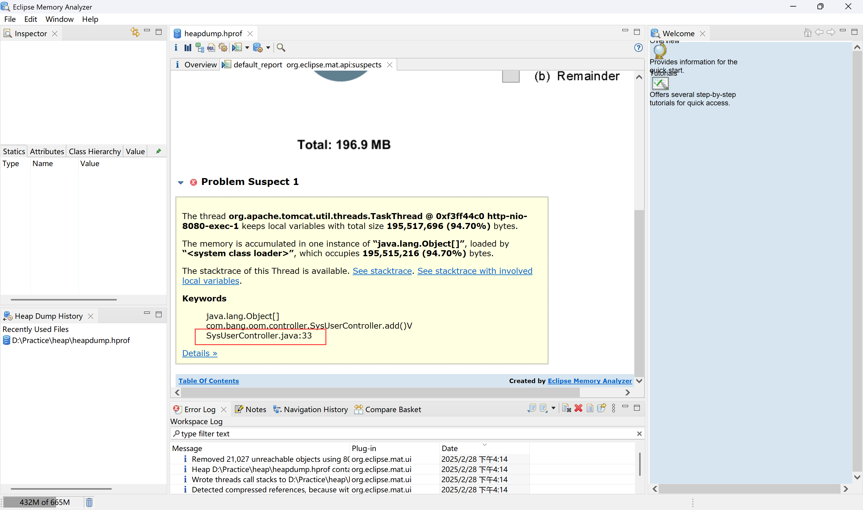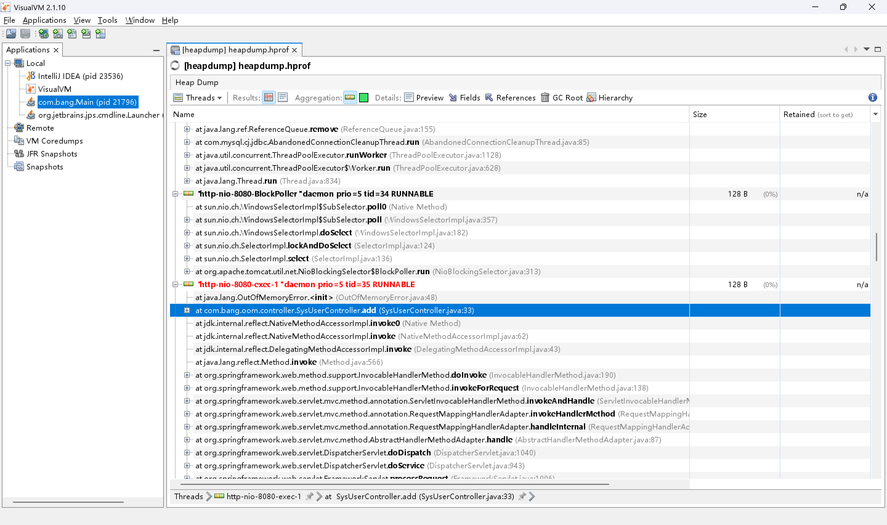 访问add接口报错:java.lang.OutOfMemoryError: Java heap space,随后在heap文件夹中就会生成heapdump.hprof文件,在log文件夹中就会生成gc-oomHeap.log文件