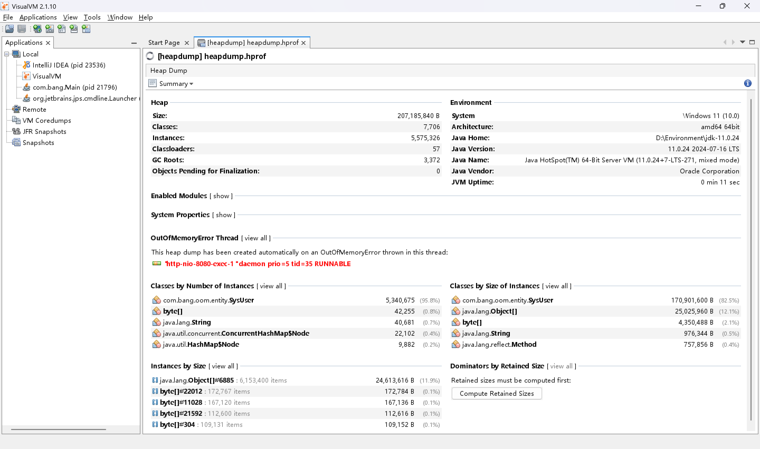 - 在这个案例中,我们设置了每个线程的栈大小为1MB(-Xss1m),并且堆内存为100MB(-Xmx100m)。程序不断地创建新线程,并且每个线程都休眠很长时间,导致线程数量迅速增加,最终耗尽内存。
