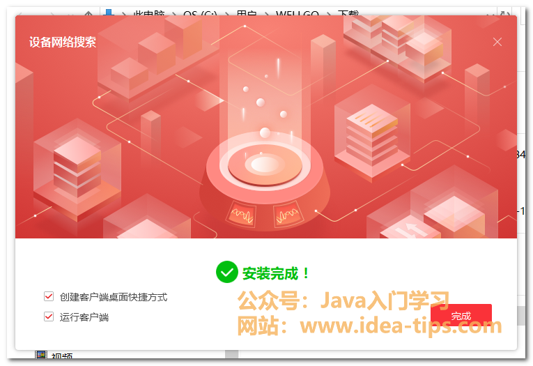 安装完成之后,点击完成按钮,默认会创建桌面快捷方式和启动客户端。