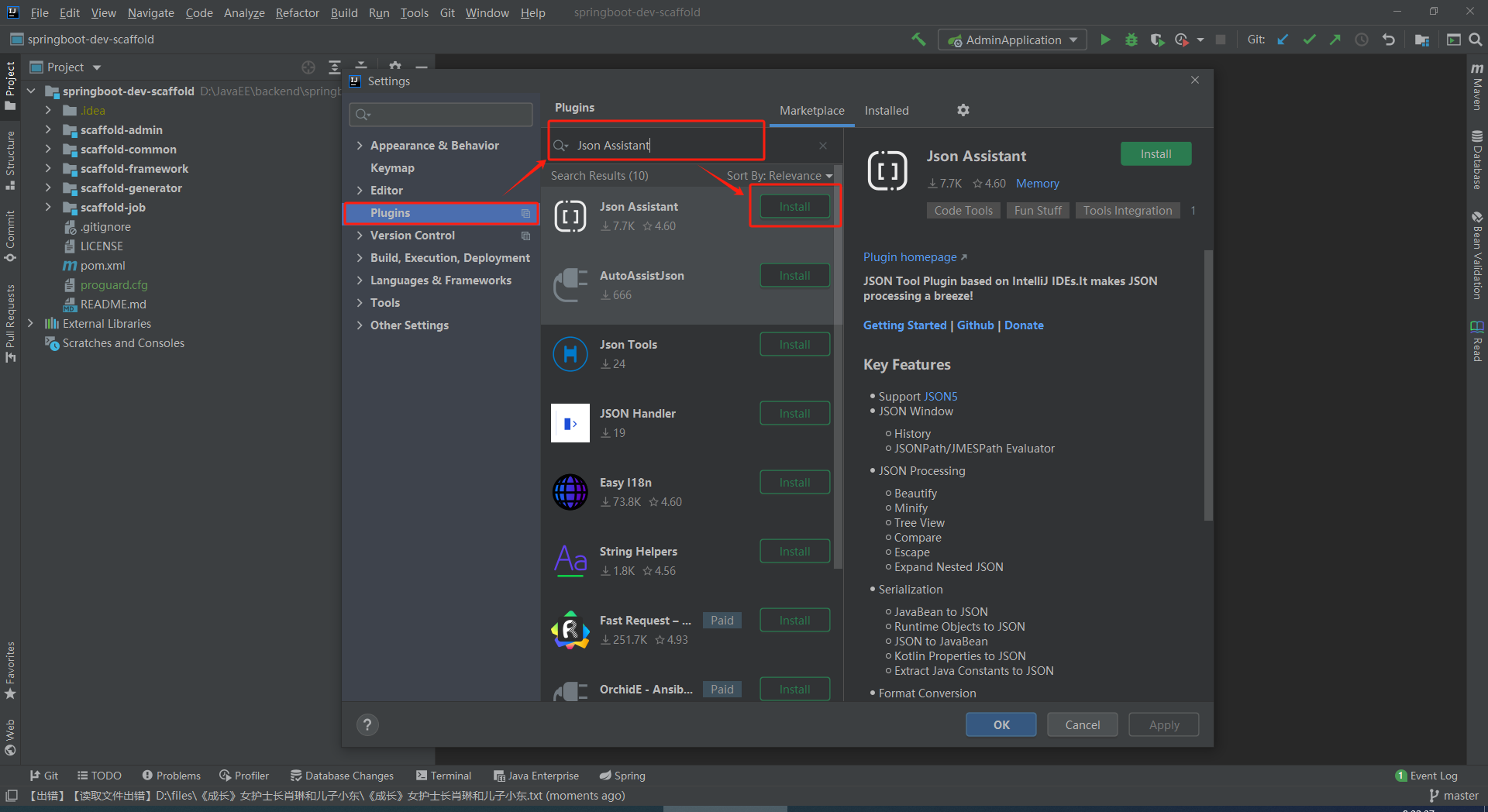 2、插件市场搜索框中输入Json Assistant,从搜索结果中找到该插件,点击Install安装插件,安装完成后重启 IDEA