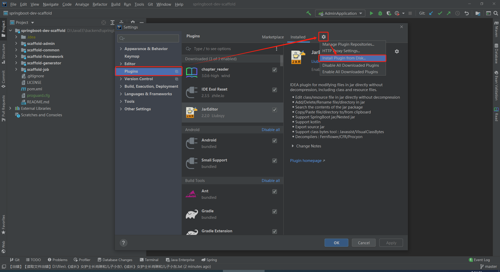 2、打开 IDEA 插件中心,并选择从本地磁盘安装,安装完成后重启 IDEA