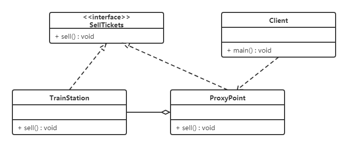 如果要买火车票的话,需要去火车站买票,坐车到火车站,排队等一系列的操作,显然比较麻烦。而火车站在多个地方都有代售点,我们去代售点买票就方便很多了。这个例子其实就是典型的代理模式,火车站是目标对象,代售点是代理对象。类图如下: