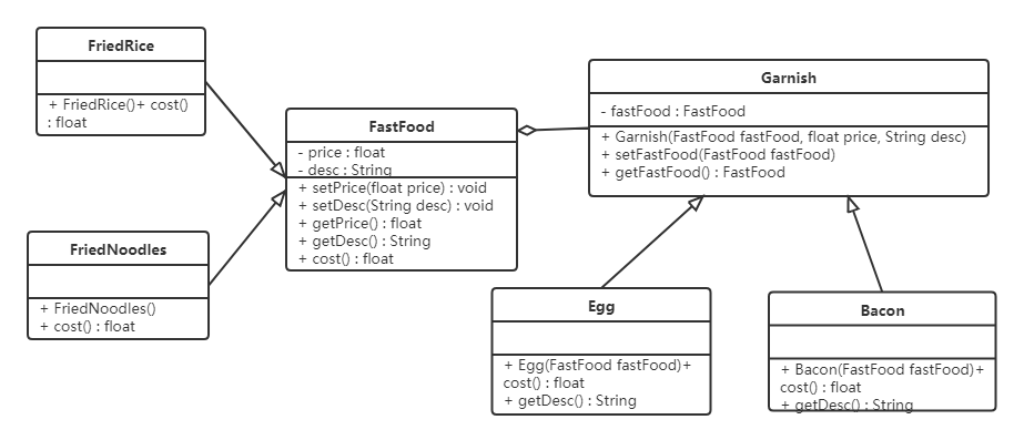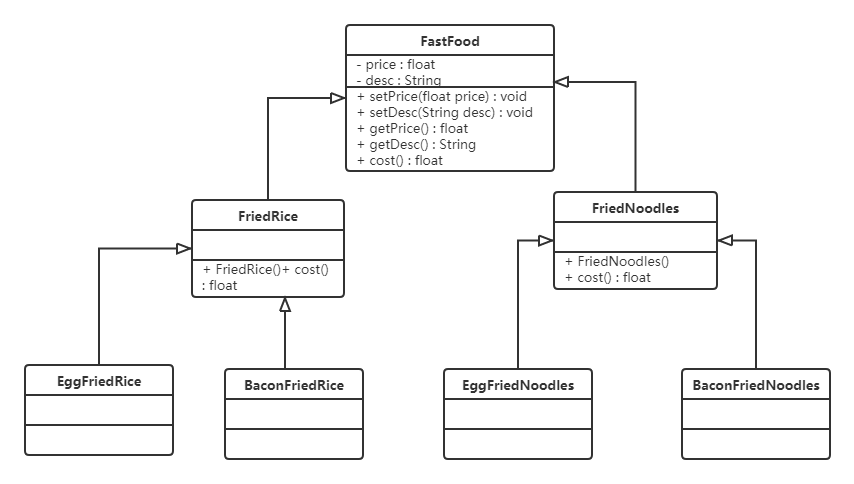 扩展性不好:如果要再加一种配料(火腿肠),我们就会发现需要给FriedRice和FriedNoodles分别定义一个子类。如果要新增一个快餐品类(炒河粉)的话,就需要定义更多的子类。