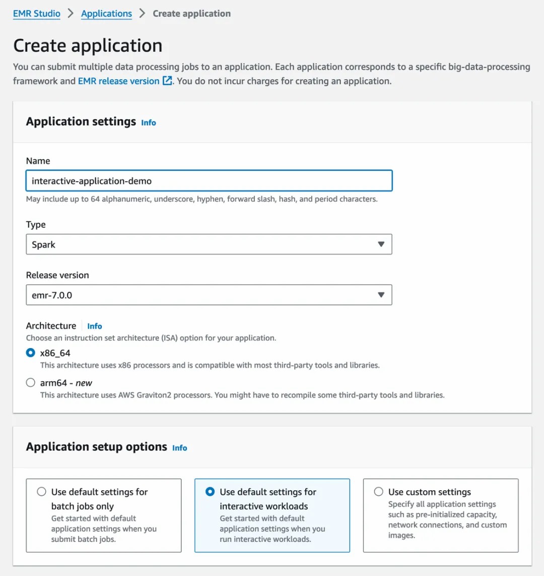 作为一个资源池,EMR 无服务器应用程序的创建通常是一次性操作。一旦设置了引擎(spark/hive),就创建了一个应用程序,初始容量和最大容量已经规划好。由于应用程序的创建并不频繁,因此通过 Web 控制台创建应用程序是一种可行的方式。