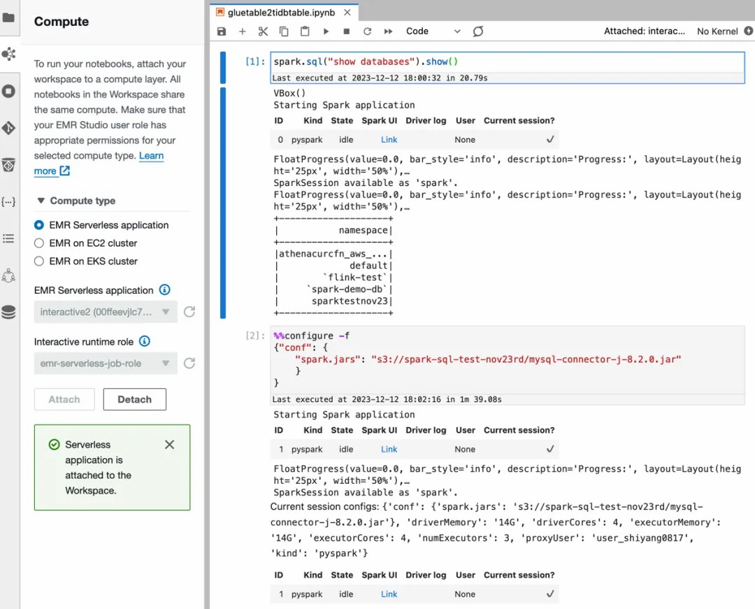 EMR Serverless 提供 EMR Studio,可以实现开放的集成测试方式。该代码是通过 Jupyter 笔记本单元编写和测试的。上游数据源和下游数据目的地可以通过在单元中编写代码来连接。然后,测试的代码可以打包为 Spark jar 文件或 pyspark 脚本文件,最后作为 EMR 无服务器作业提交。