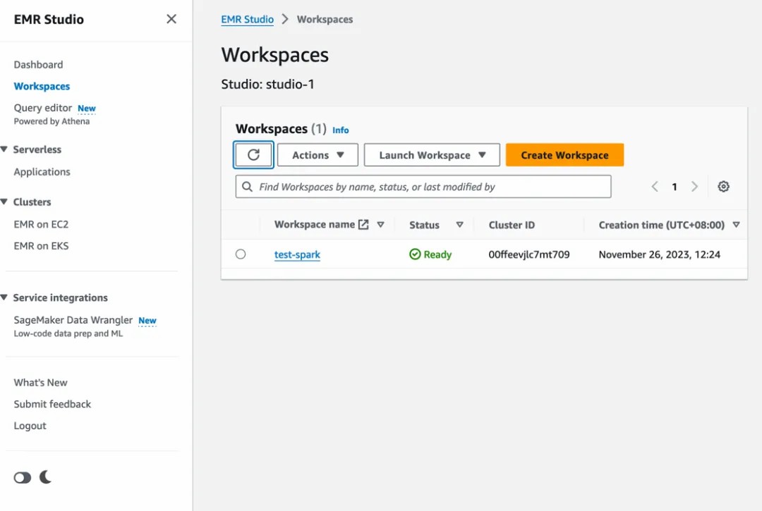 在 EMR Studio 下创建一个工作区,如下图所示: