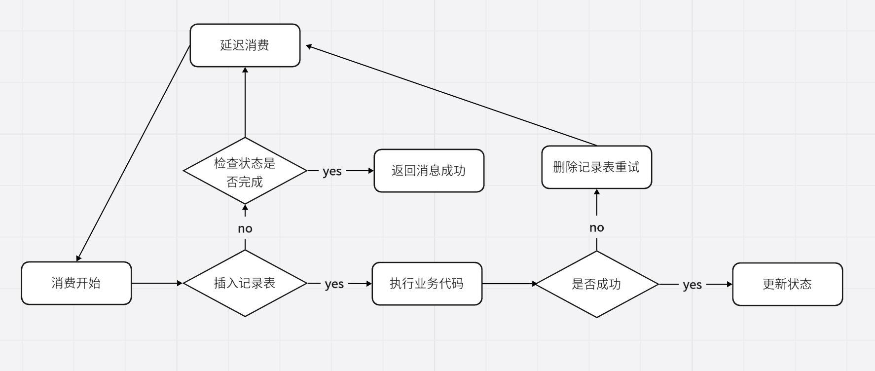 这个时候会有一个问题,如果在执行业务代码时出现了宕机等状况,没有来得及删除删除记录表数据,会出现消息开始 -> 插入状态 ->延迟消费的死循环,这个时候就需要人工干预,或者记录消息消费的消费次数时候还是不是需要再消费