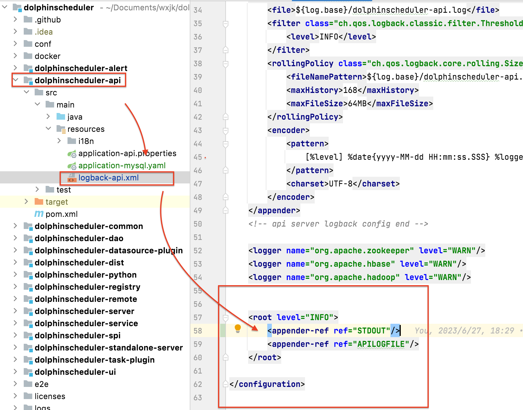 ② 修改日志输出到控制台,在 dolphinscheduler-api