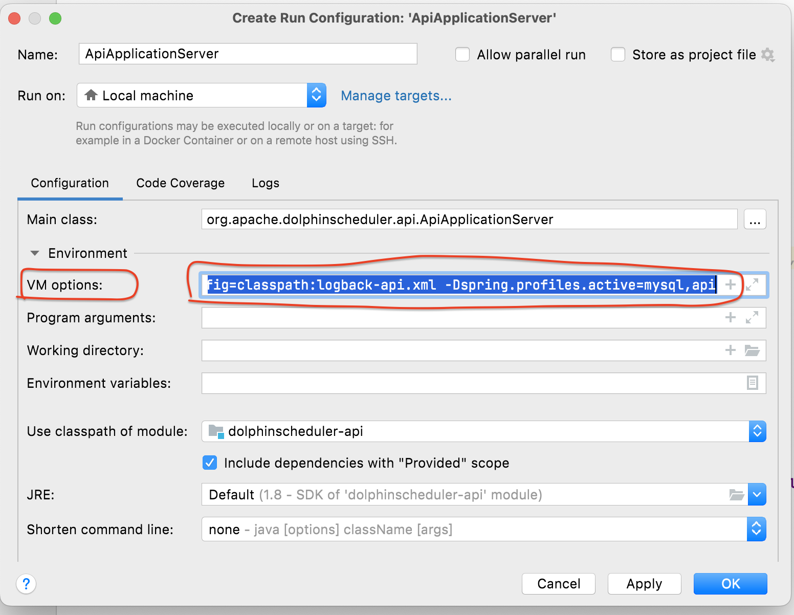配置 \_VM Options : \_-Dlogging.config=classpath:logback-api.xml -Dspring.profiles.active=mysql,api