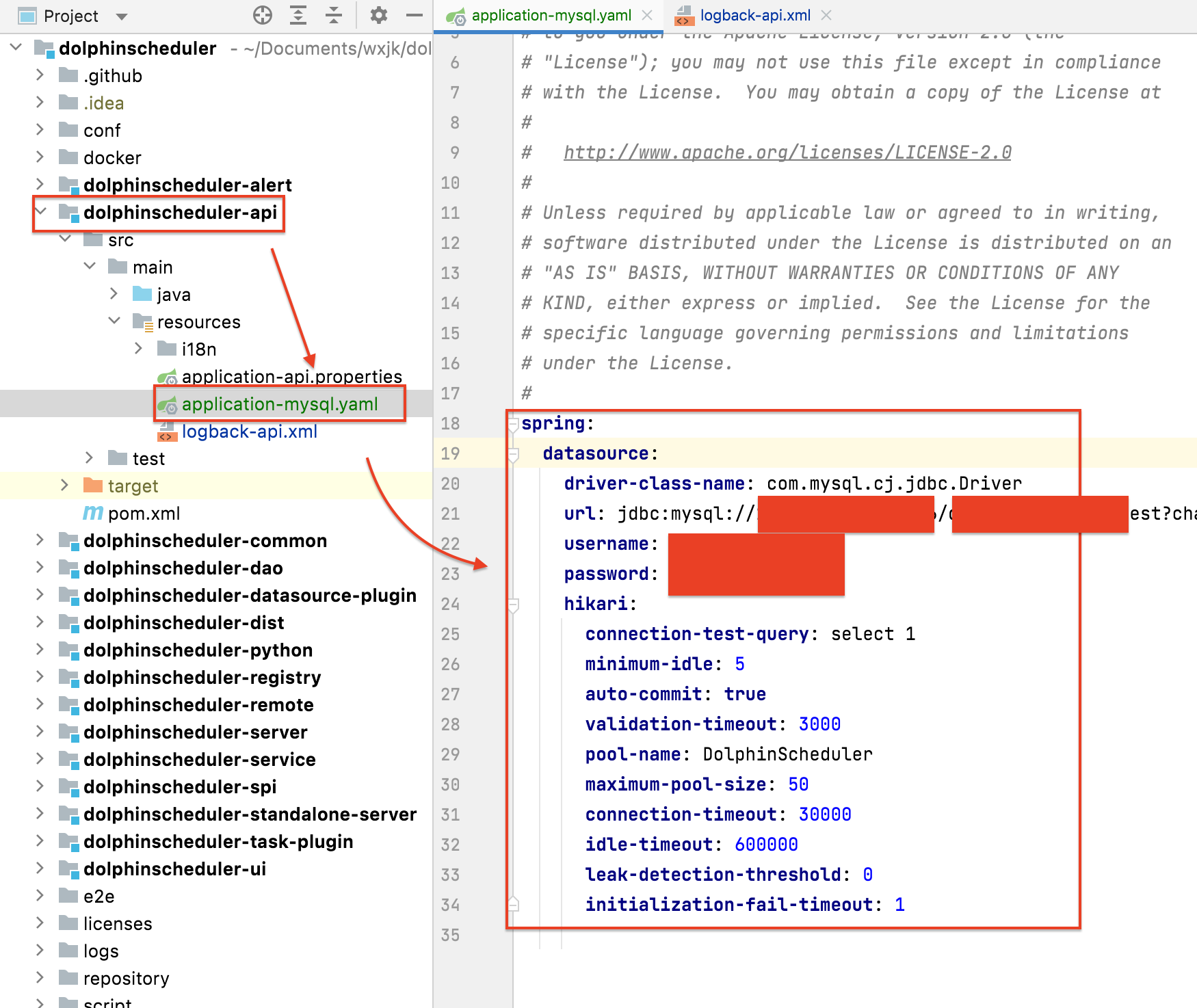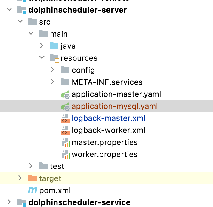 在 3.X 版本中,在 dolphinscheduler-master 模块的 resources 下面,新增 yaml 文件application-mysql.yaml