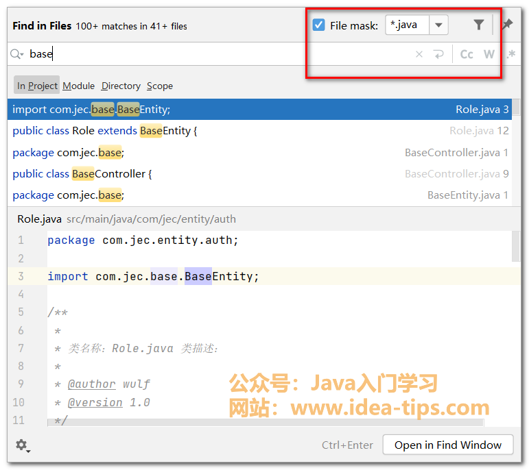 注意,右侧有搜索的筛选项,比如上面的File mask,可以用*.等,去匹配不同后缀的类型,比如*.java,这样就可以匹配只查找java文件的。同时,右侧的大小写匹配和整个单词匹配也是可以选择的。