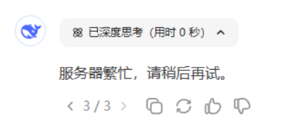 相信大家都已经有体验过deepseek-r1的强大推理能力,由于其网页版本免费使用的原因,用户量激增、同时据传还遭受了大量的网络攻击,这使得过程不是很流程,经常收到类似下图的问题: