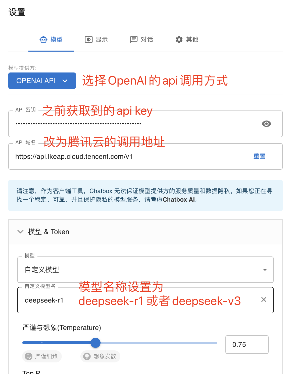 https://api.lkeap.cloud.tencent.com/v1 - 使用deepseek的模型名,比如: