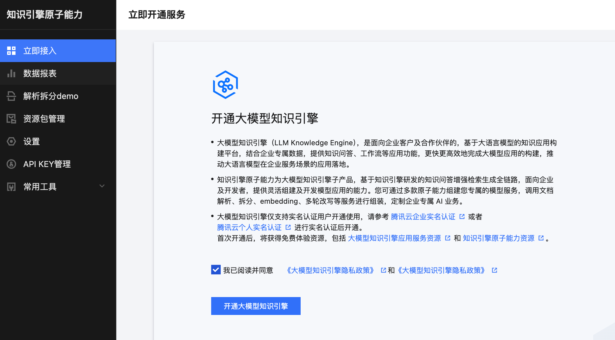 - 先准备一个腾讯云账号,进入腾讯云知识引擎原子能力: https://console.cloud.tencent.com/lkeap