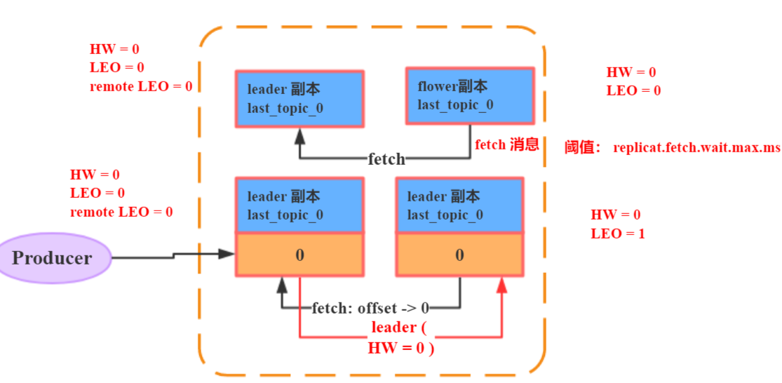 初始状态下,leader 和 follower 的 HW 和 LEO 都是 0,leader 副本会保存 remote LEO,表示所有 follower LEO, 也会被初始化为 0,这个时候,producer 没有发送消息。