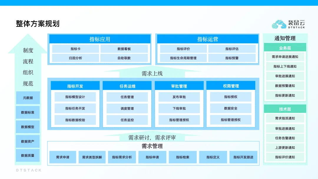 为了应对上述挑战,袋鼠云沉淀出一套综合的指标管理平台解决方案,涵盖规范建设、需求管理、指标开发与运维等部分。