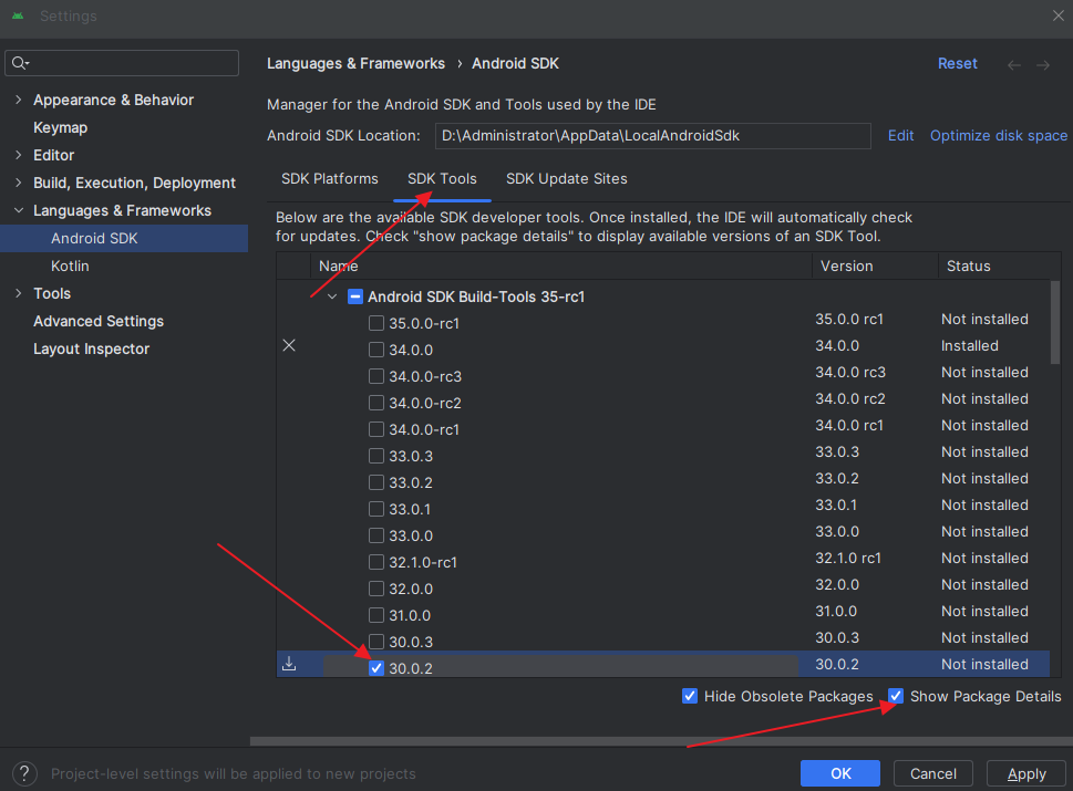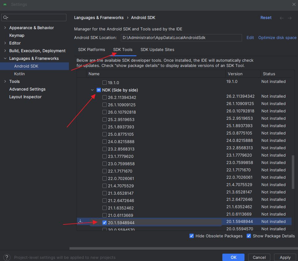 还没完,在”SDK Tools”选项卡,点击”NDK (Side by side)”,同样勾中右下角的”Show Package Details”,选择20.1.5948944版