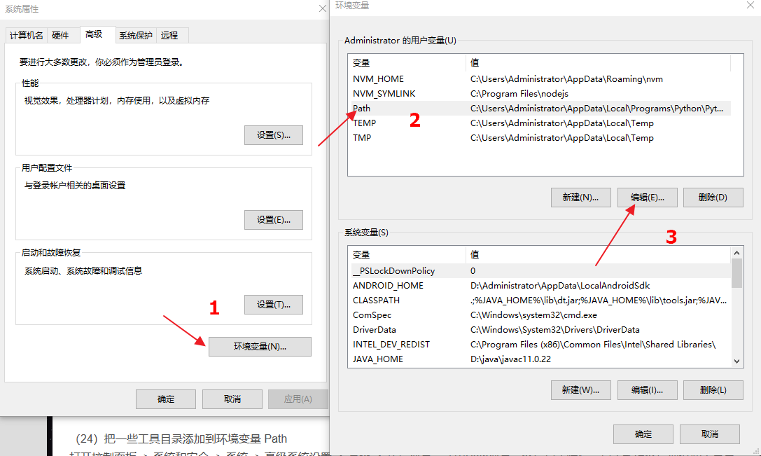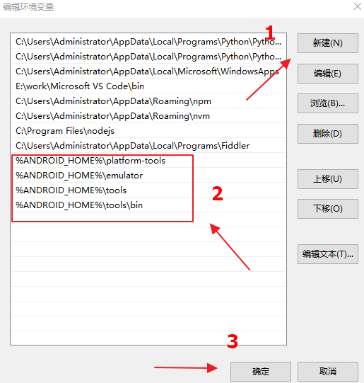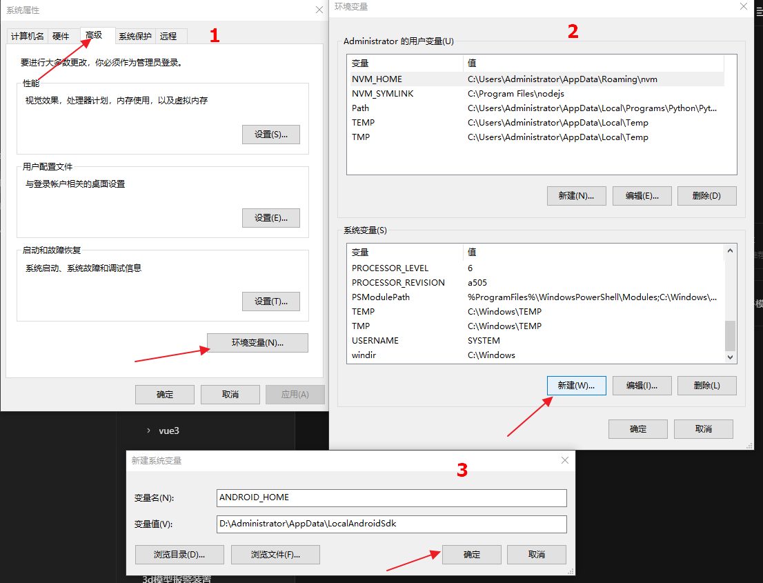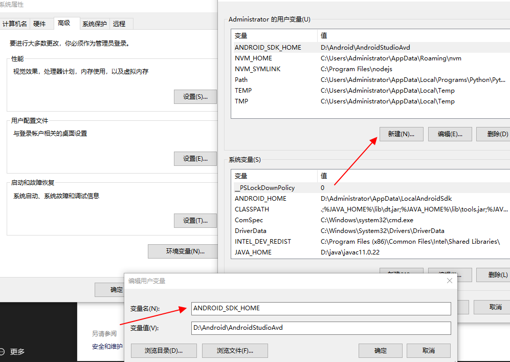 打开控制面板 -> 系统和安全 -> 系统 -> 高级系统设置 -> 高级 -> 环境变量 -> 新建,创建一个名为ANDROID_HOME的环境变量,它指向的是你的 Android SDK 所在的目录,具体的路径可能和下图不一致,请自行确认