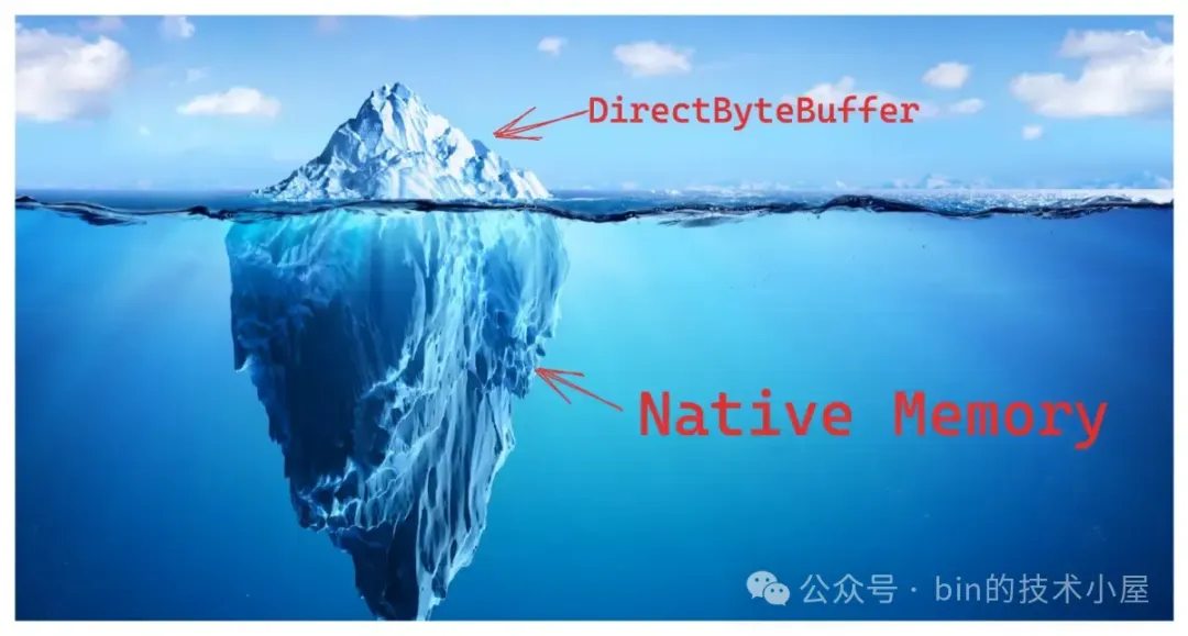 DirectByteBuffer 的实例可以形象的比喻为冰山对象,JVM 可以看到的只是 DirectByteBuffer 在 JVM 堆中的内存占用,但这部分内存占用很小,就相当于是冰山的一角。