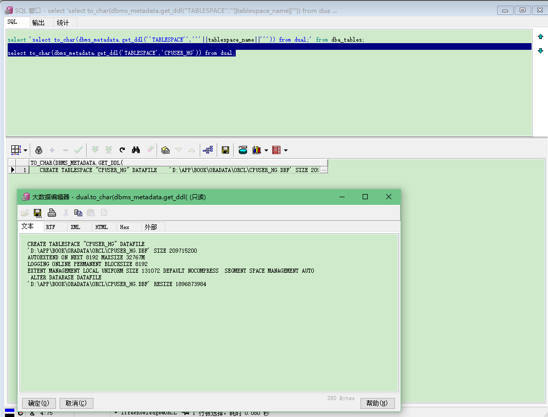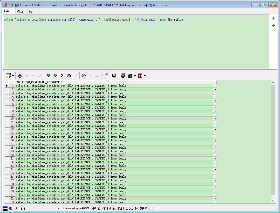 select 'select to_char(dbms_metadata.get_ddl(''TABLESPACE'','''||tablespace_name||''')) from dual;' from dba_tables;