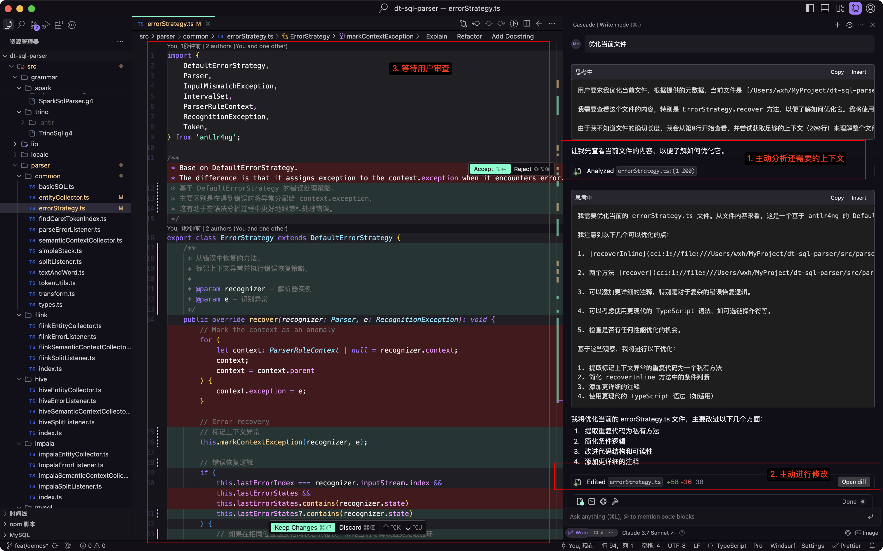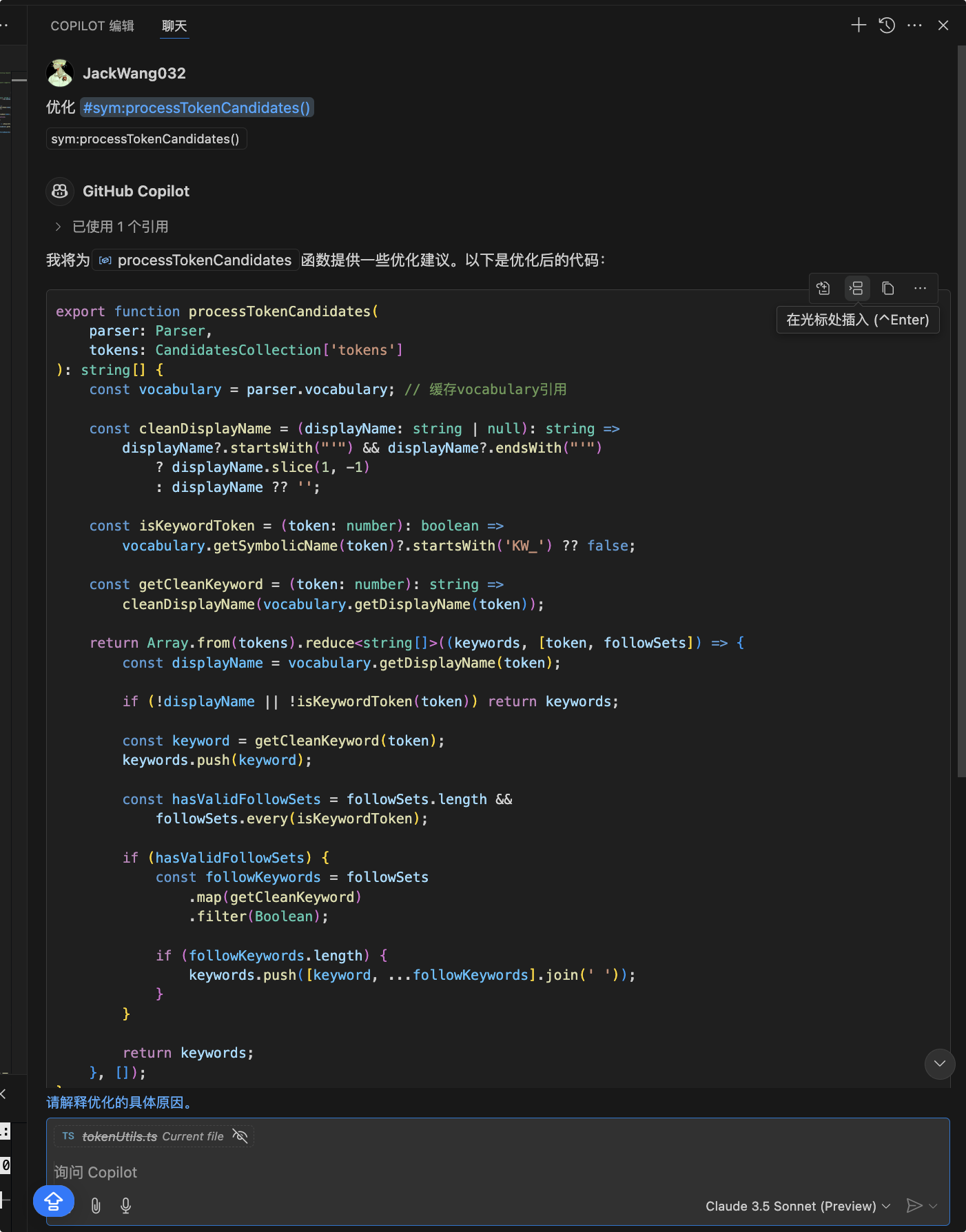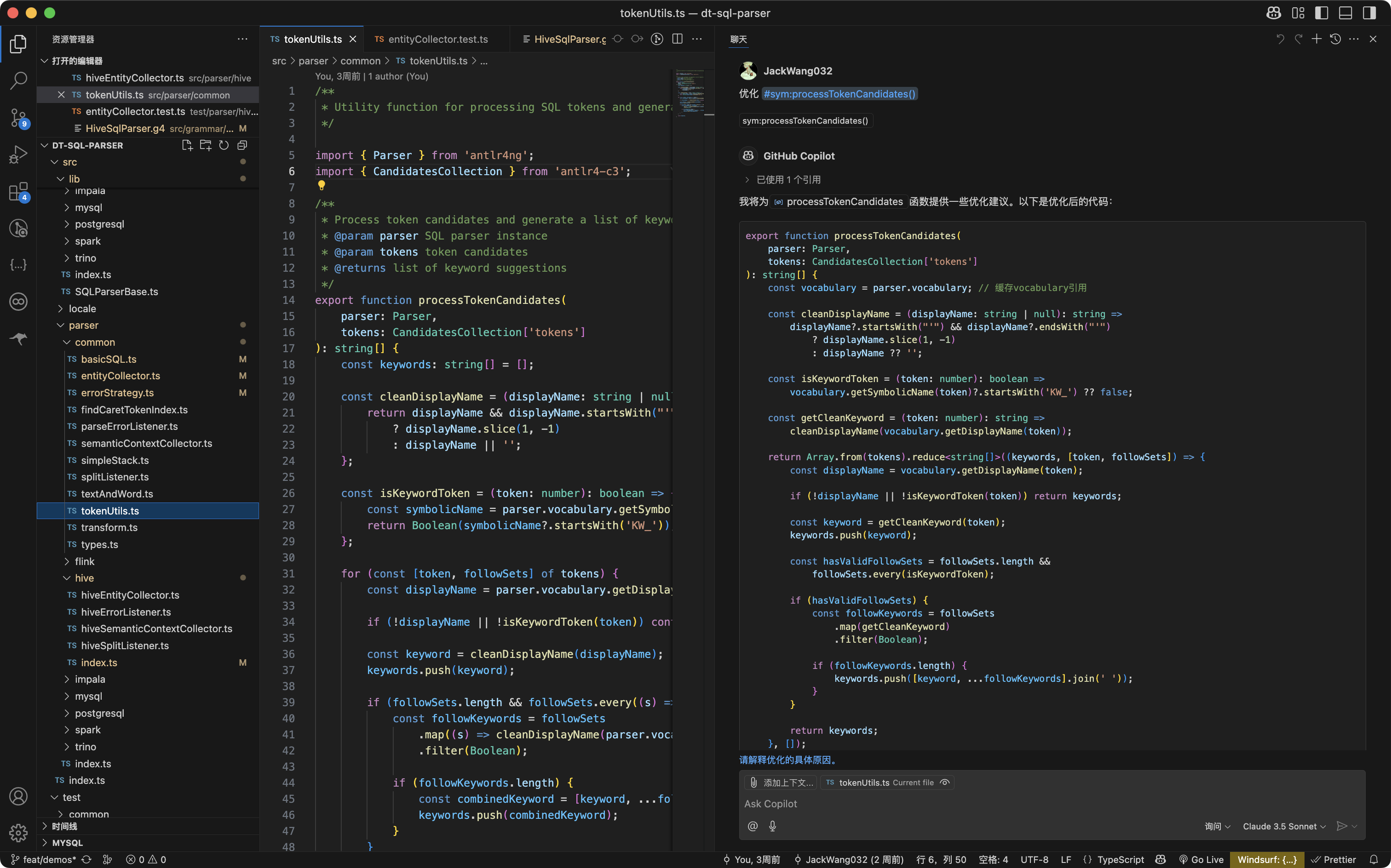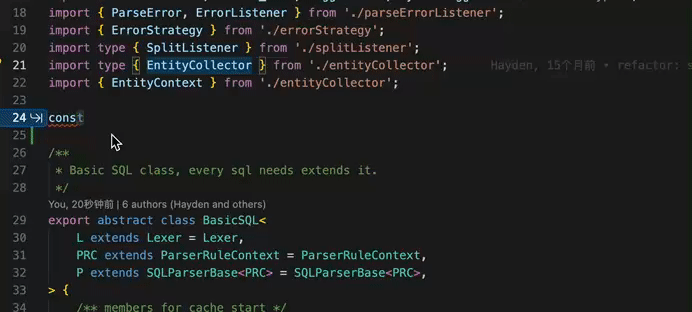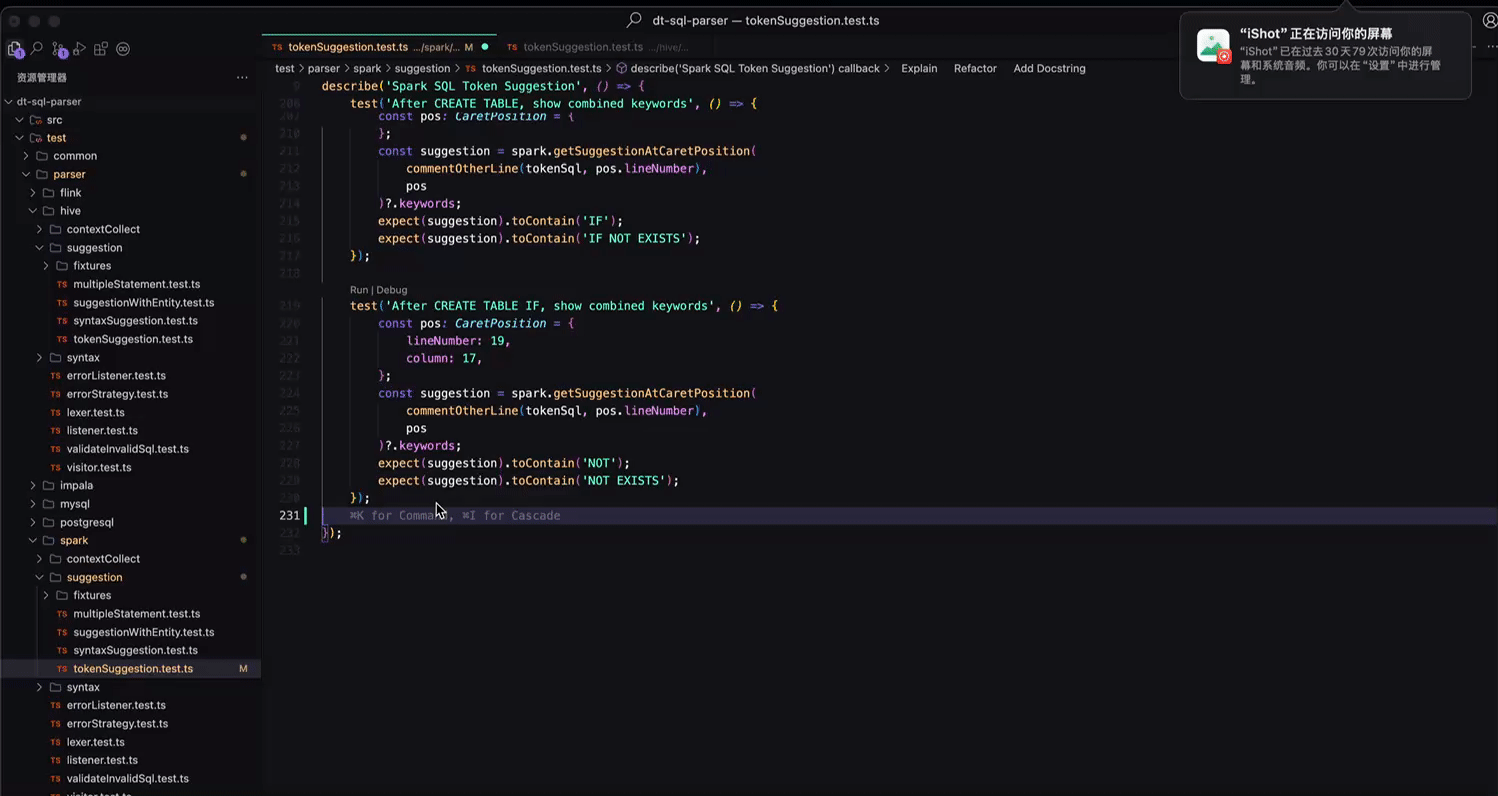 以我们的开源项目 dt-sql-parser 为例,每新增一种功能或者 bug 修复都要支持多种 SQL 语言,在补充单测时显得尤为枯燥与乏力,相似的工作做了N遍。基于智能补全的上下文感知,只需在一种语言中编写一次代码,在其他语言中就能直接一路 Tab 到位完成不同语言的单测编写。