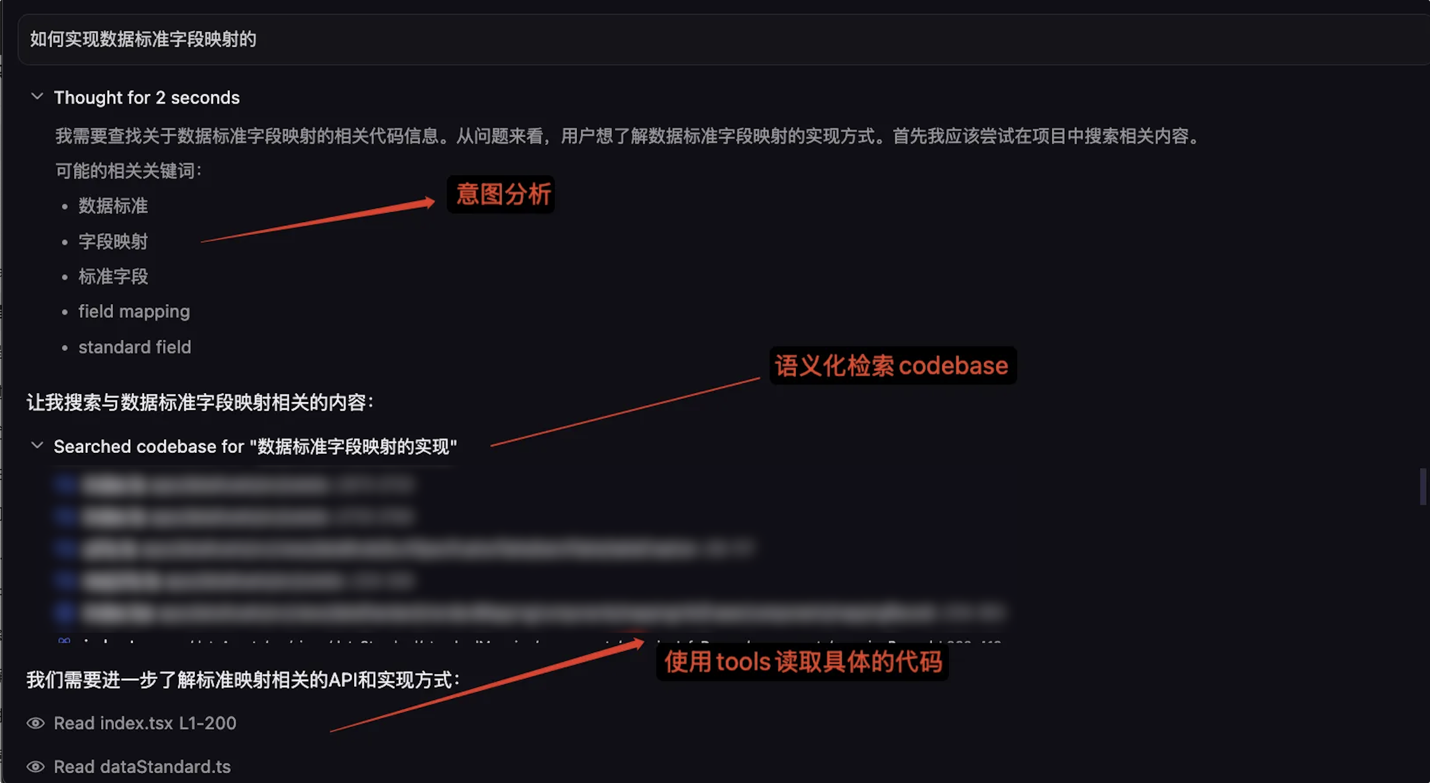 - 在用户进行提问时,大模型进行意图识别是否需要调用代码库检索工具,客户端检索向量数据库找到与用户提问相关联的代码,并将其作为上下文的一部分发送给大模型