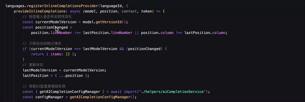 智能补全是 AI 编程开发中最先被发掘出也是最基础的功能。即在当前光标位置后通过行内补全的形式(灰色的代码块)提供后续可能的代码。