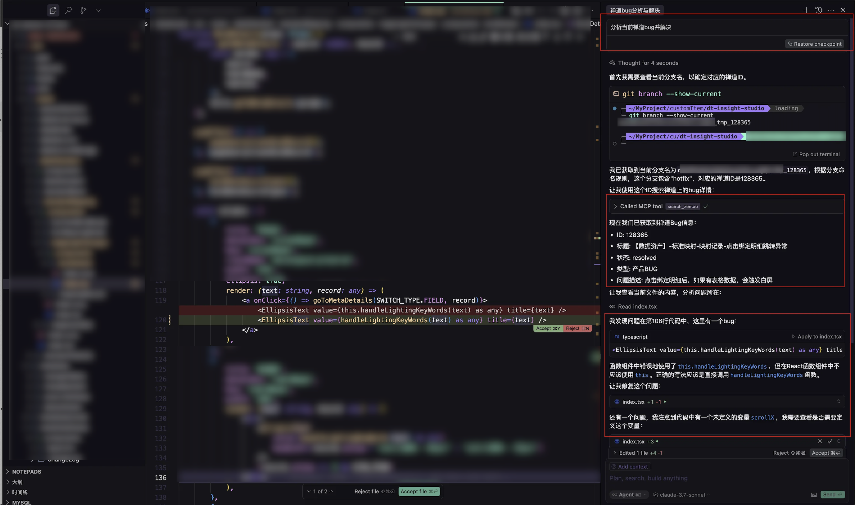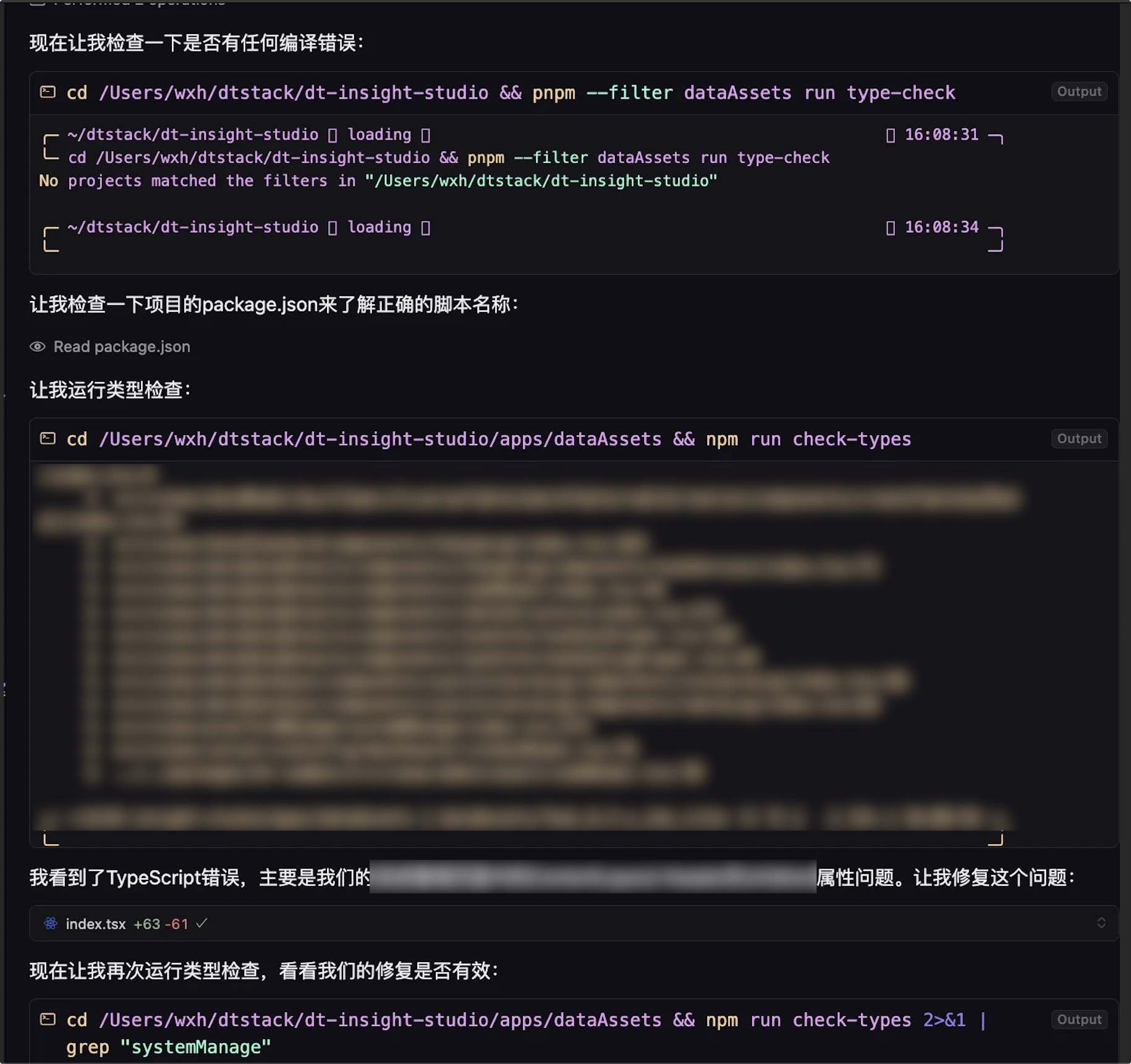 自我修正能减少需要程序员的介入情况,例如 Agent 自主帮我们修改代码后,ts类型报错了或者产生了幻觉引用了不存在的方法,那么 Agent 在感知到报错信息后会自行去尝试修复,最终解决问题,整个流程中我们只需要做好一开始的提示词输入工作即可。